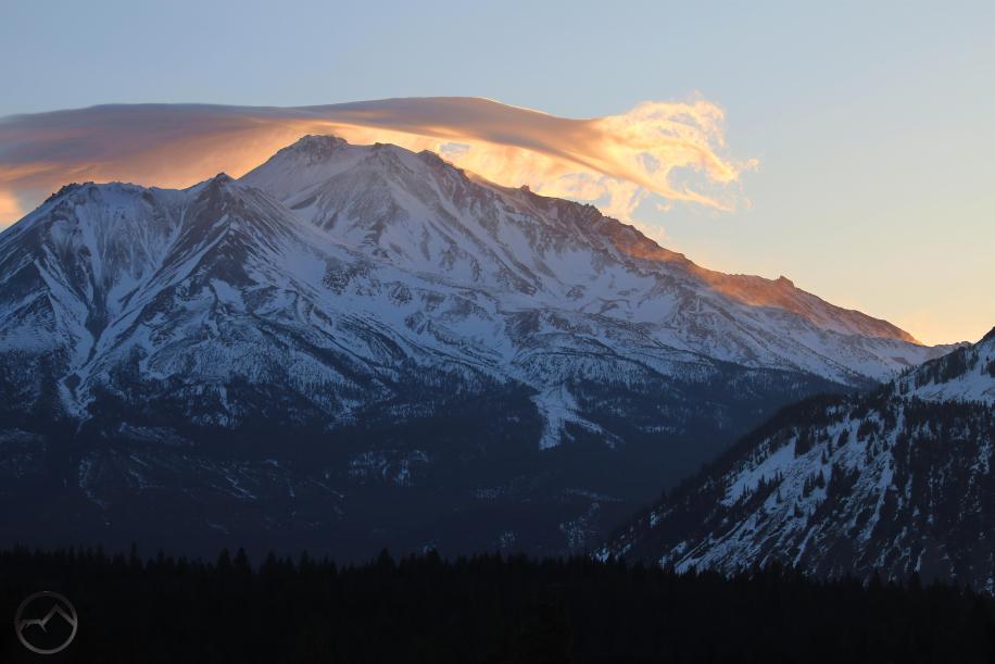 While I considered heading over to McCloud for the sunrise, I knew I didn’t have time so instead I climbed up to the west. Though the mountain did not have any direct light on it, the lenticular was lit up nicely.