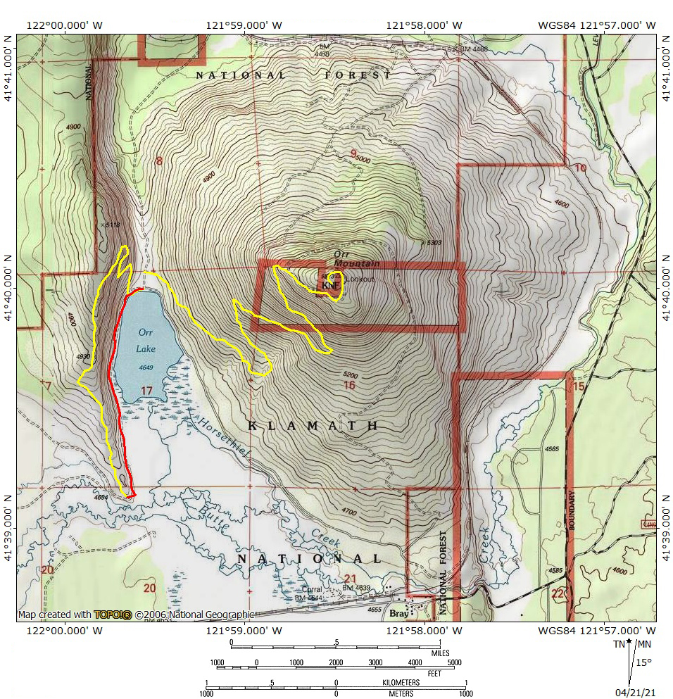 Time spent camping at Orr Lake over the weekend set me to thinking about the recreational opportunities at the site. It is a place that is generally off the radar, as are most places in the Klamath National Forest’s Goosenest Ranger District. There is one trail, which leads from the group camp out toward Butte Creek. While cross country travel and road hiking are pretty easy, given the excellence of the location and quality of the campgrounds, I think the area could benefit from a few more trails. In particular, a route up the ridge on the west side of the lake, forming a loop with the Butte Creek trail would be fantastic. A well-graded trail up to the summit of Orr Mountain would also be a great addition to the area. Between those hikes, exploring the meadow and fishing or kayaking the lake, I think Orr Lake would be a first rate destination. As it is, it is already fantastic.