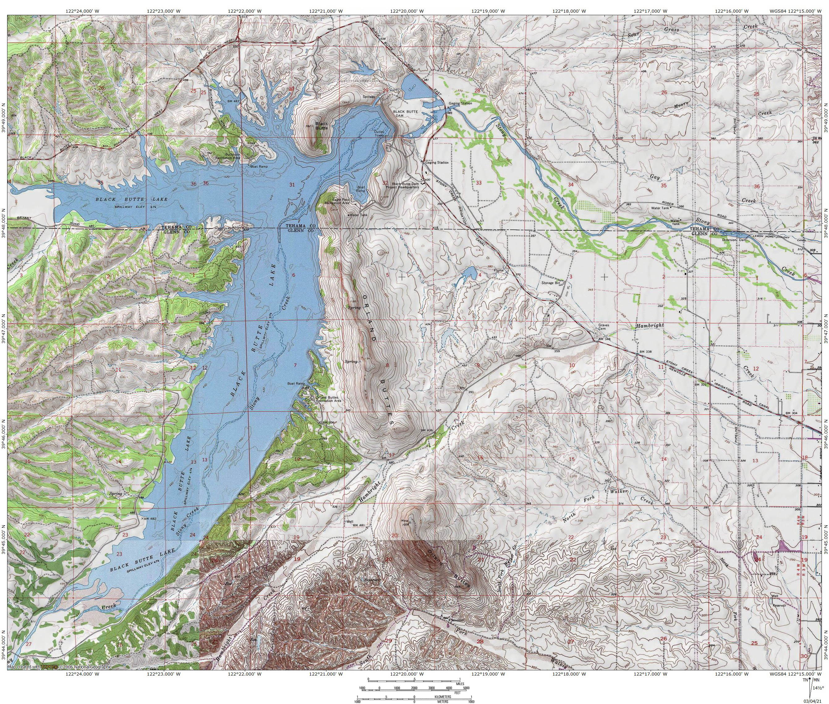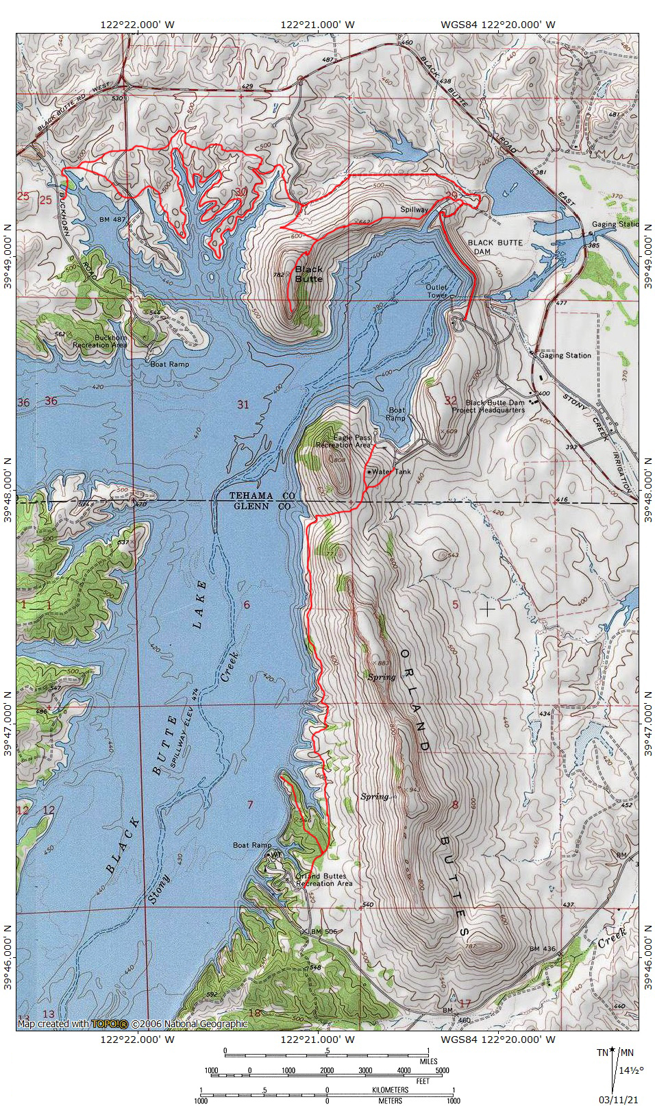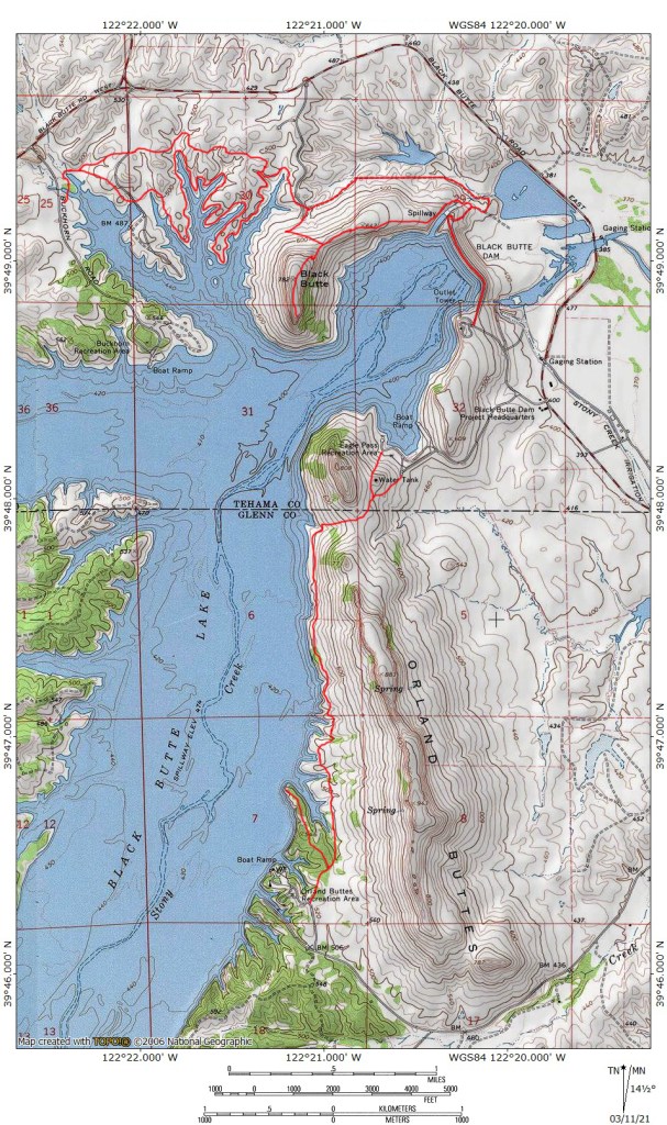 The area between the Buttes and the Coast Range foothills is now occupied by Black Butte Lake, an impounded reservoir on Stoney Creek. This creek begins high up on Snow Mountain, the Coast Range’s southernmost 7,000 foot peak. It flows roughly northeast, through rugged canyons and through the buckled ridges of the valley before reaching the Orland Buttes. A dam in Eagle Pass backs the water up and forms the lake. From there, the creek continues a short distance to the east before joining the mighty Sacramento River. It’s total journey is nearly 90 miles and drains an area of over 700 square miles. While the sight of Stony Creek passing between the ramparts of the Orland Buttes would have been a beautiful sight, especially in its spring fury, the truth is, Black Butte Lake is a beautiful addition to the Orland Buttes and does add a fair amount of interest to the area. The land around the lake, and therefore the Buttes themselves, is administered by the Bureau of Reclamation. This means that the land is open to the public and exploring the Buttes is welcome.