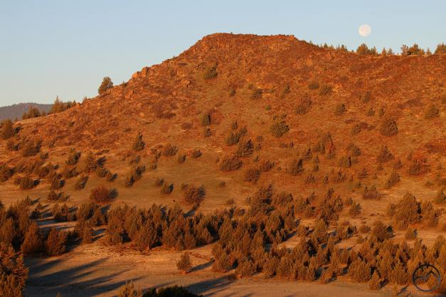After the sun was well and up, I headed to the back side of the ridge, and saw the valley on that side of the ridge was almost totally free of fog. The the moon was about to set behind Cerro Pedernal, the peak immediately to the north. After watching the sun rise, I was blessed to watch the moon set. It was quiet and all the recent precipitation has made green grass sprout up everywhere. Moments like this make life rich.