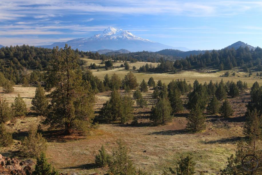 Mount Shasta looms in the distance, beyond a fine specimen of juniper. The rain storms that passed through the area a few weeks ago turned the grass green once again.