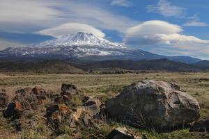 A pair of awesome lenticular formations grace mighty Mount Shasta.