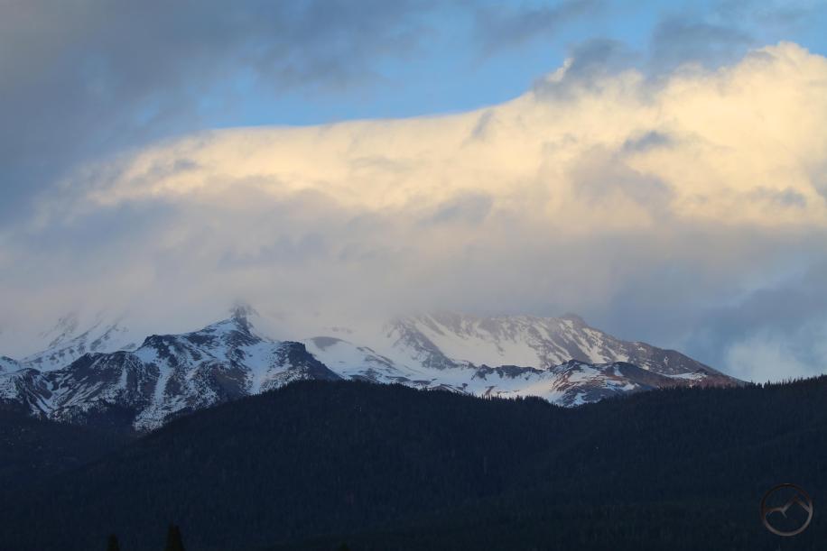 By the time the sun sank behind the Trinity Divide, the show was generally over. The clouds to the north were overtaking Mount Shasta itself, the summit cloud had given up its definition and the southwestern cloud, which was the first of this episode to manifest, was gone.