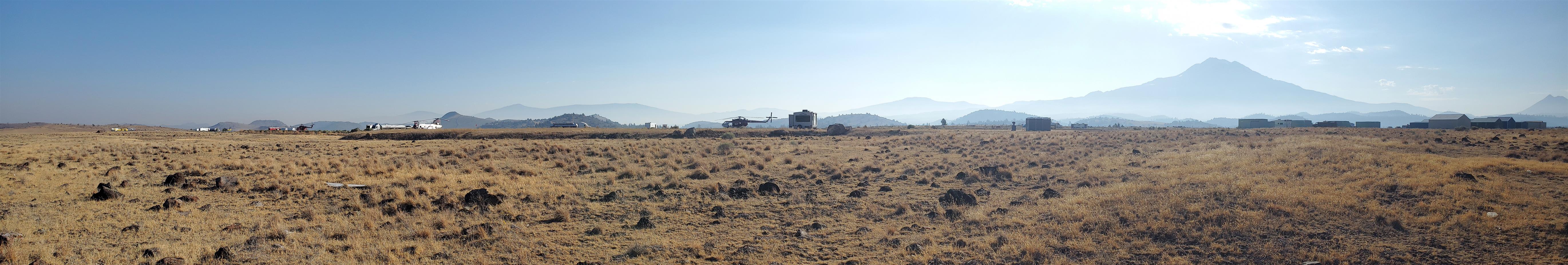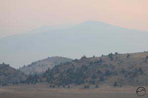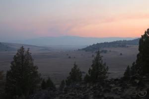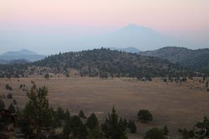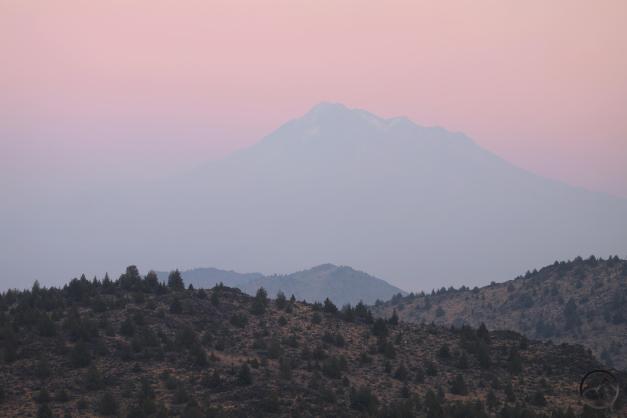 Looking away from the mountain, I normally find myself drawn to the view south, where the entwined ridges lining the canyon of the Sacramento River for a pleasing array that lead the eye to distant mountains to the south (namely Shasta Bally, Bully Choop and the high peaks of the Yolla Bolly Mountains). However, this night, the conditions were such that I was more impressed with the view west, where the high crags of the Trinity Alps formed a jagged horizon against the orange sky.