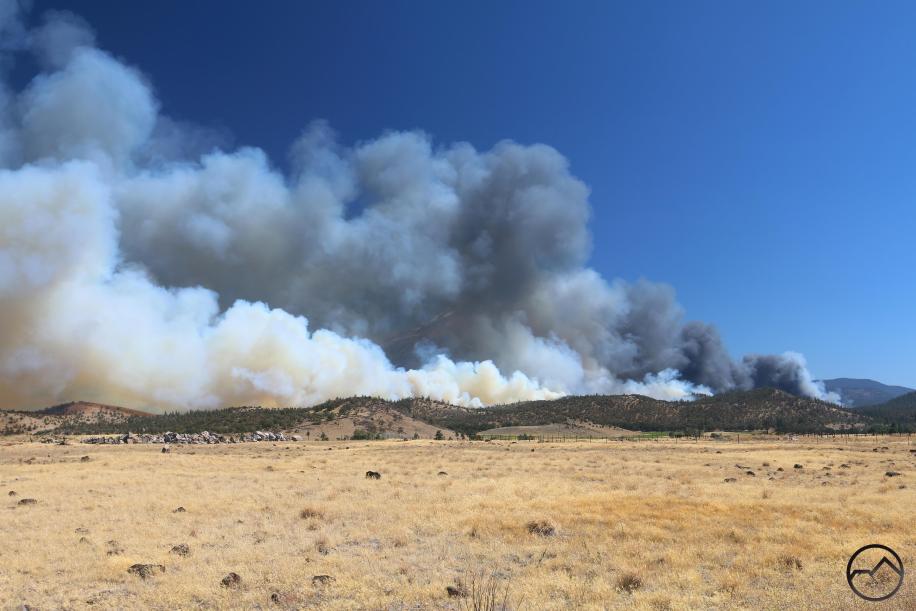 From the Weed airport, Mount Shasta can bee seen through the Mill Fire’s Smoke. The black smoke is from the mill and other buildings in Weed. The white smoke is from the grass burning as the fire races north.