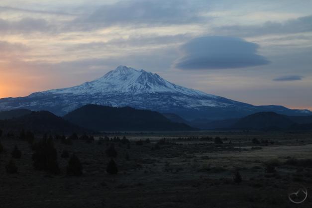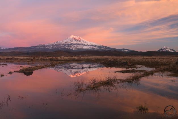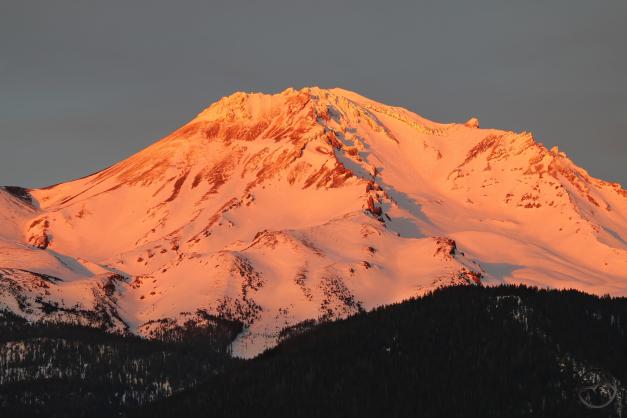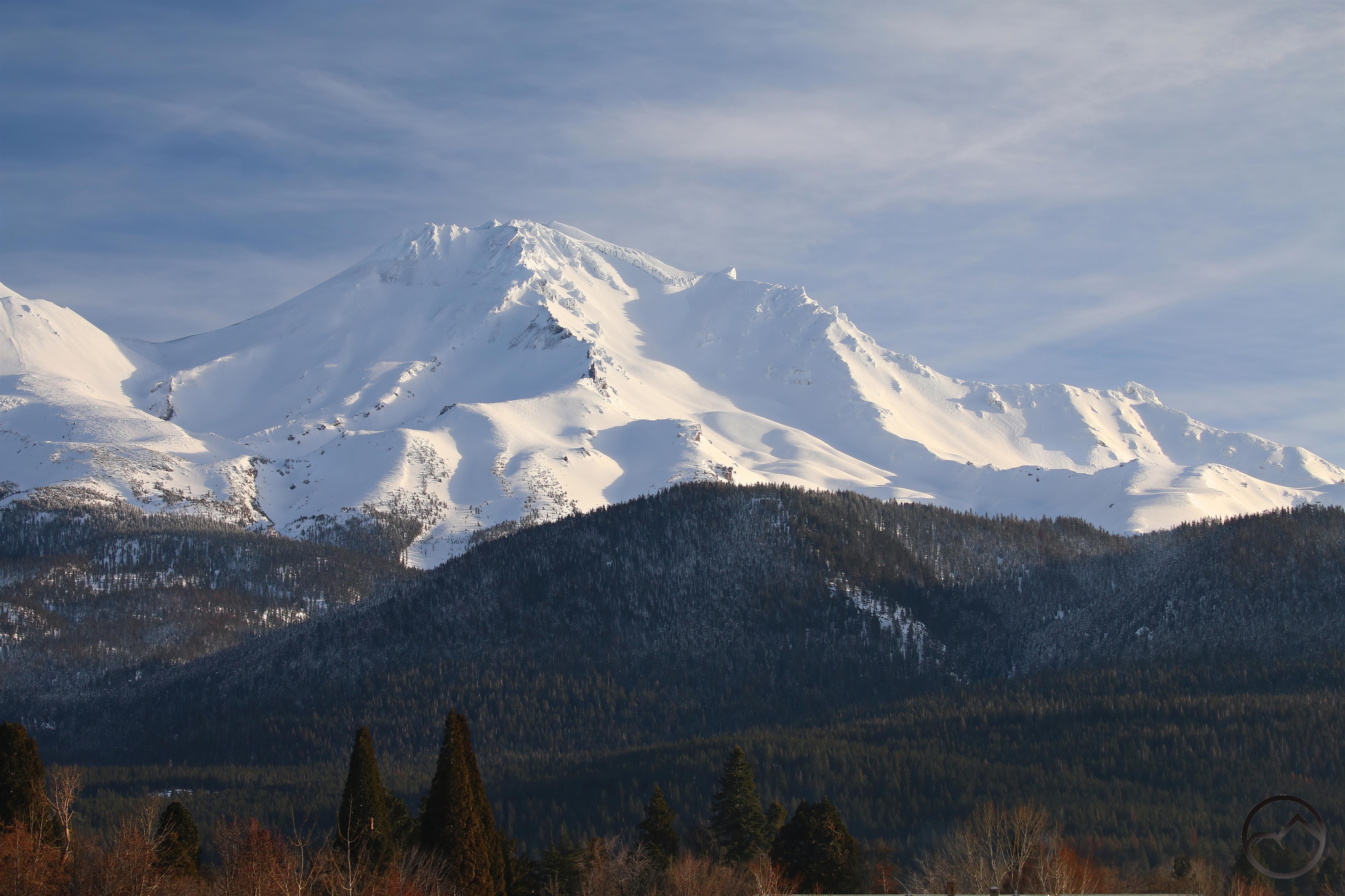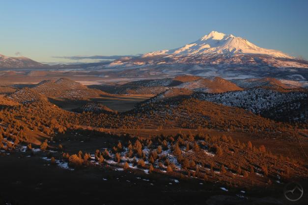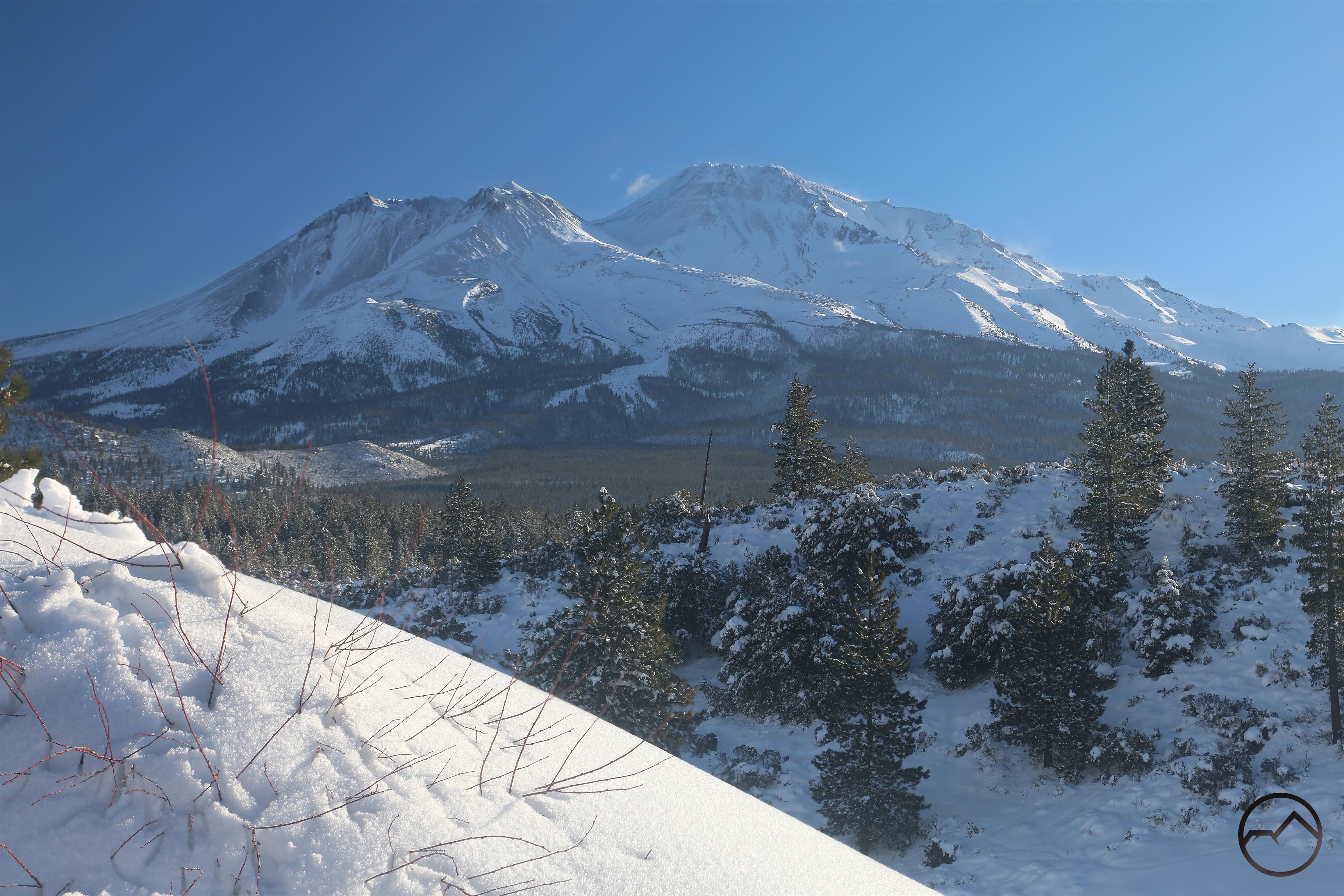 Fresh snow and Mount Shasta on a winter’s morning.