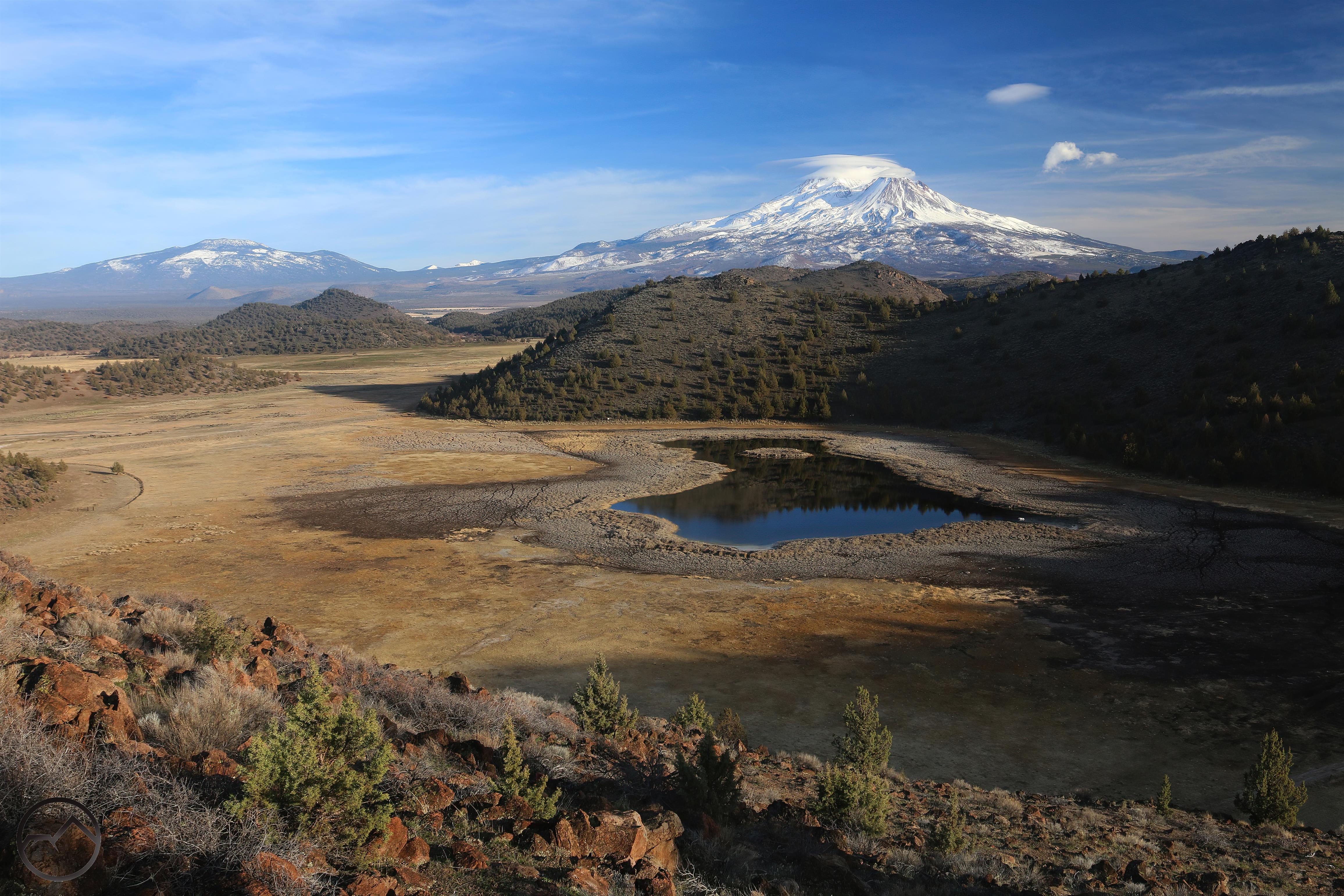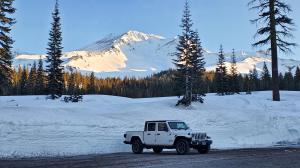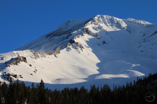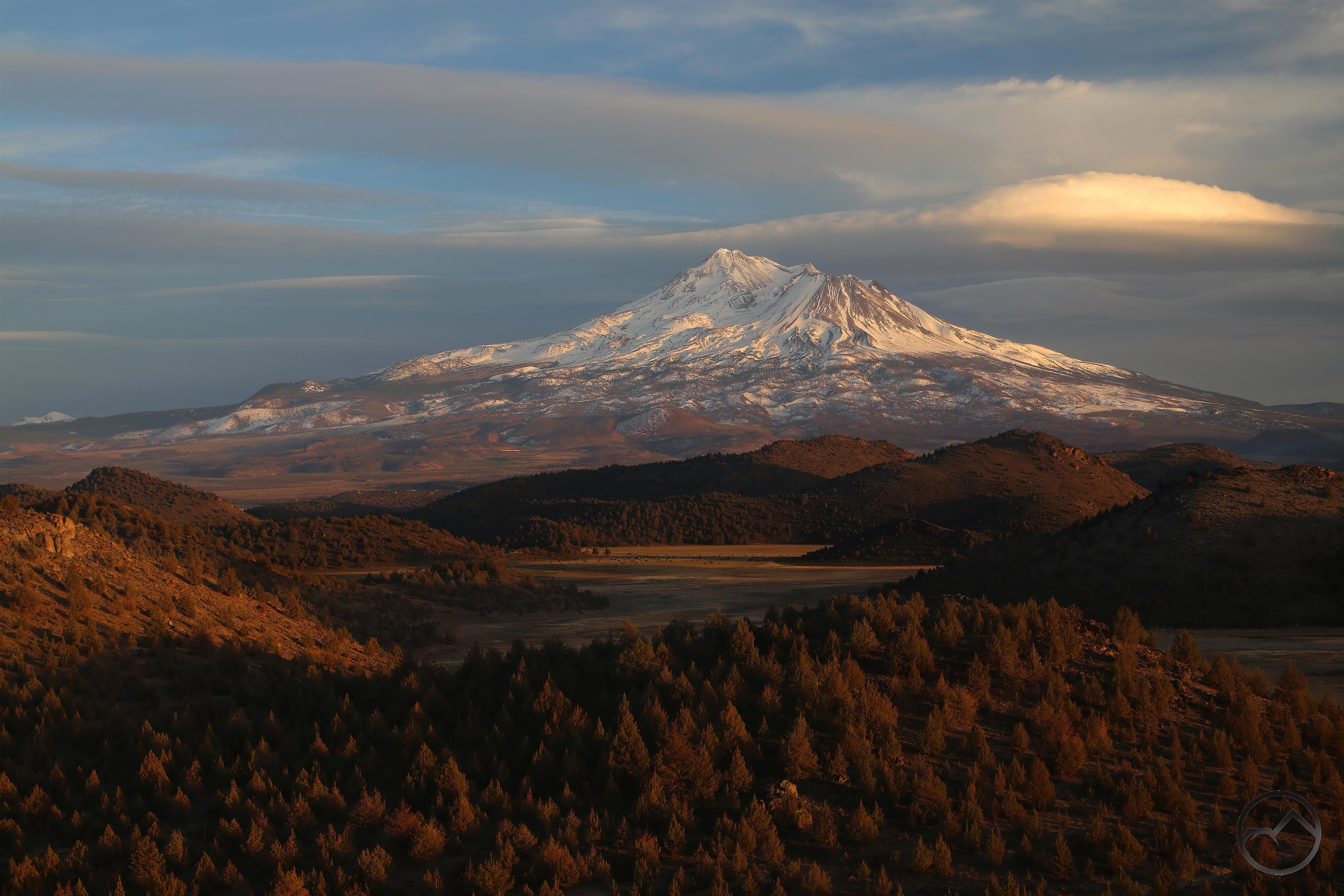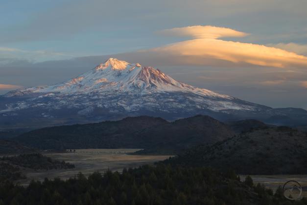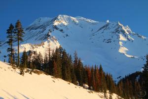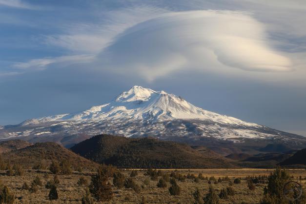 Fresh snow and Mount Shasta on a winter’s morning.