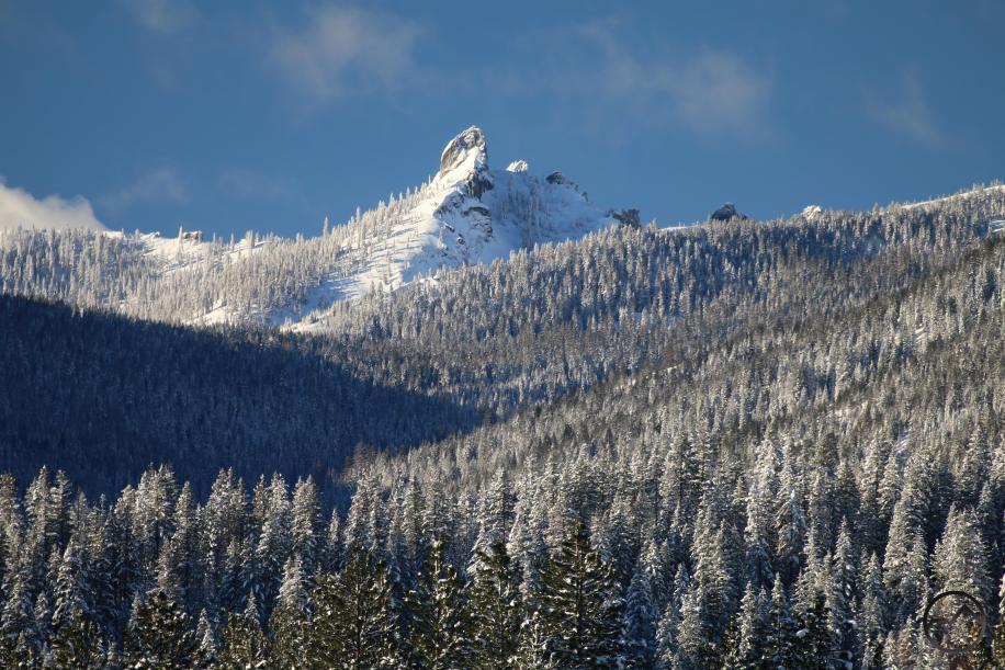 Castle Spire aka Battle Rock, the highest point in the Castle Crags looked like an inverted icicle from town.