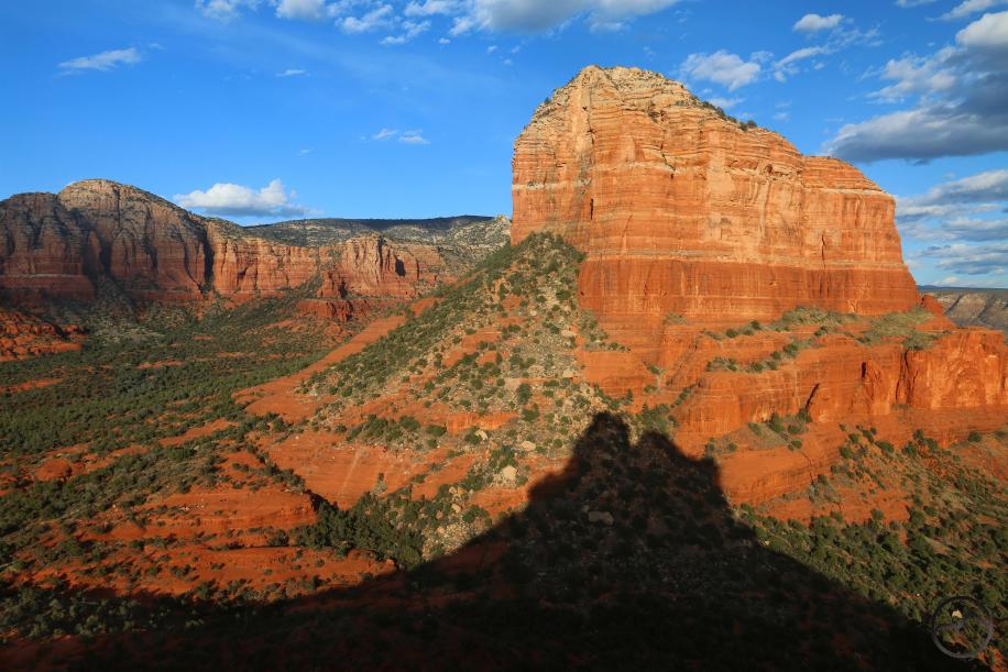 Bell Rock’s shadow falls on Courthouse Butte as the setting sun lights up the Munds Mountain Wilderness.