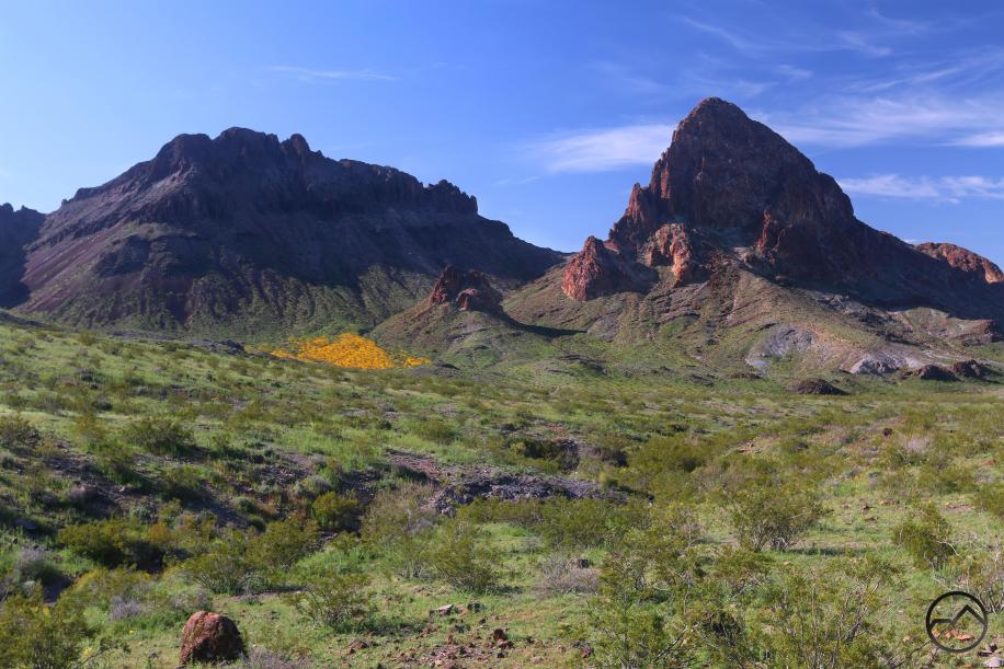 Poppies and green grass cover the expanse below Boundary Cone, on the edge of the Mojave Desert.