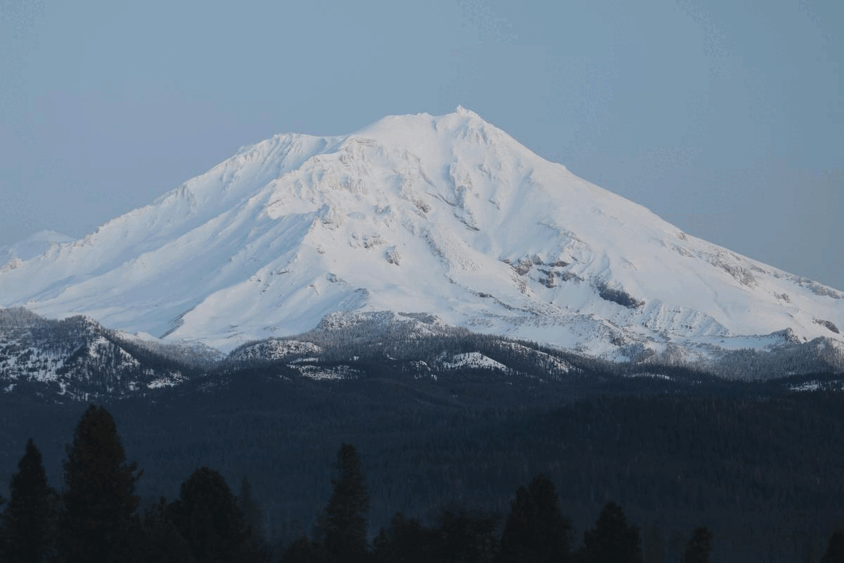 For the solstice, I headed out to McCloud, to catch the morning glow on the fresh white snow. There wasn’t much in the way of clouds to catch the sunrise’s color but it was still a beautiful sight as first the summit then the icy flanks of Mount Shasta began to glow. The light washed down the mountain, finally lighting up the dark forest below the snowline. It was a fine sunrise, not extraordinary in conditions but extraordinary simply because it was a sunrise on Mount Shasta!