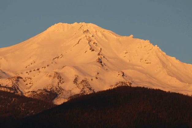 Just as the light flowed down the sides of Mount Shasta at sunrise, at sunset it undid itself, climbing up the snowy crags until the last vestige disappeared off the crown. Again, now clouds added to the spectacle but it was a colorful and beautiful sight nonetheless.