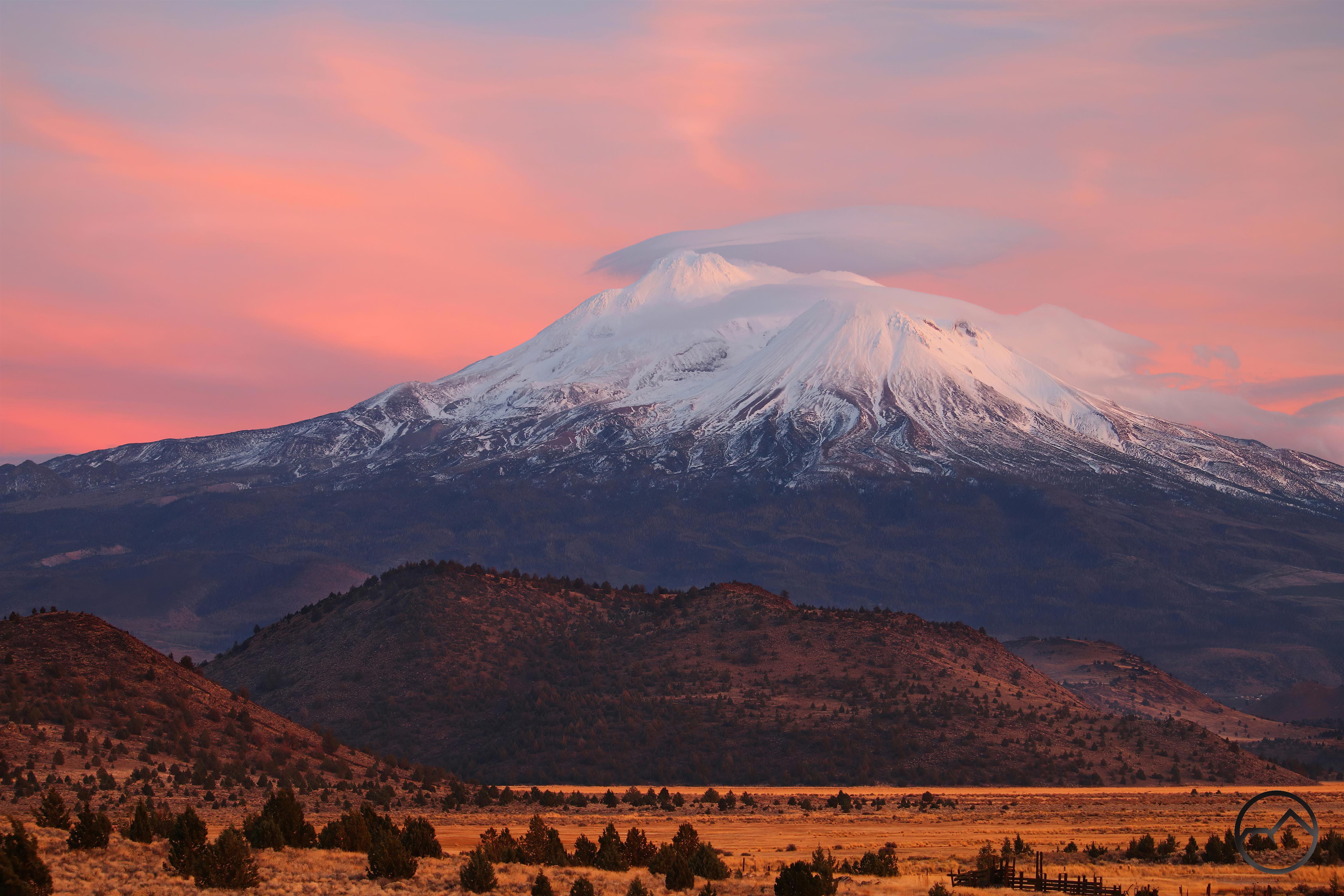 A glowing sunset highlights a lenticular-clad Mount Shasta.