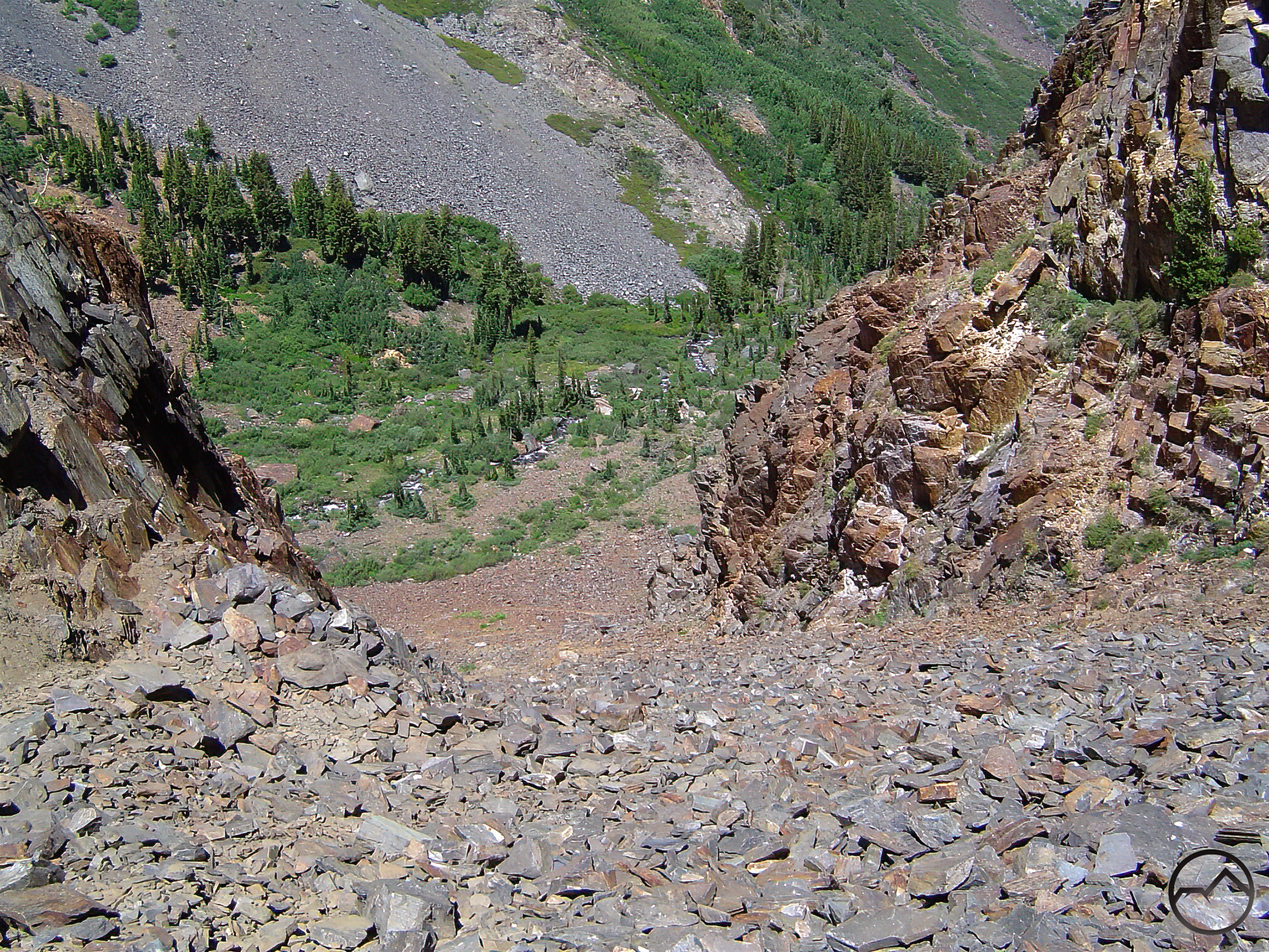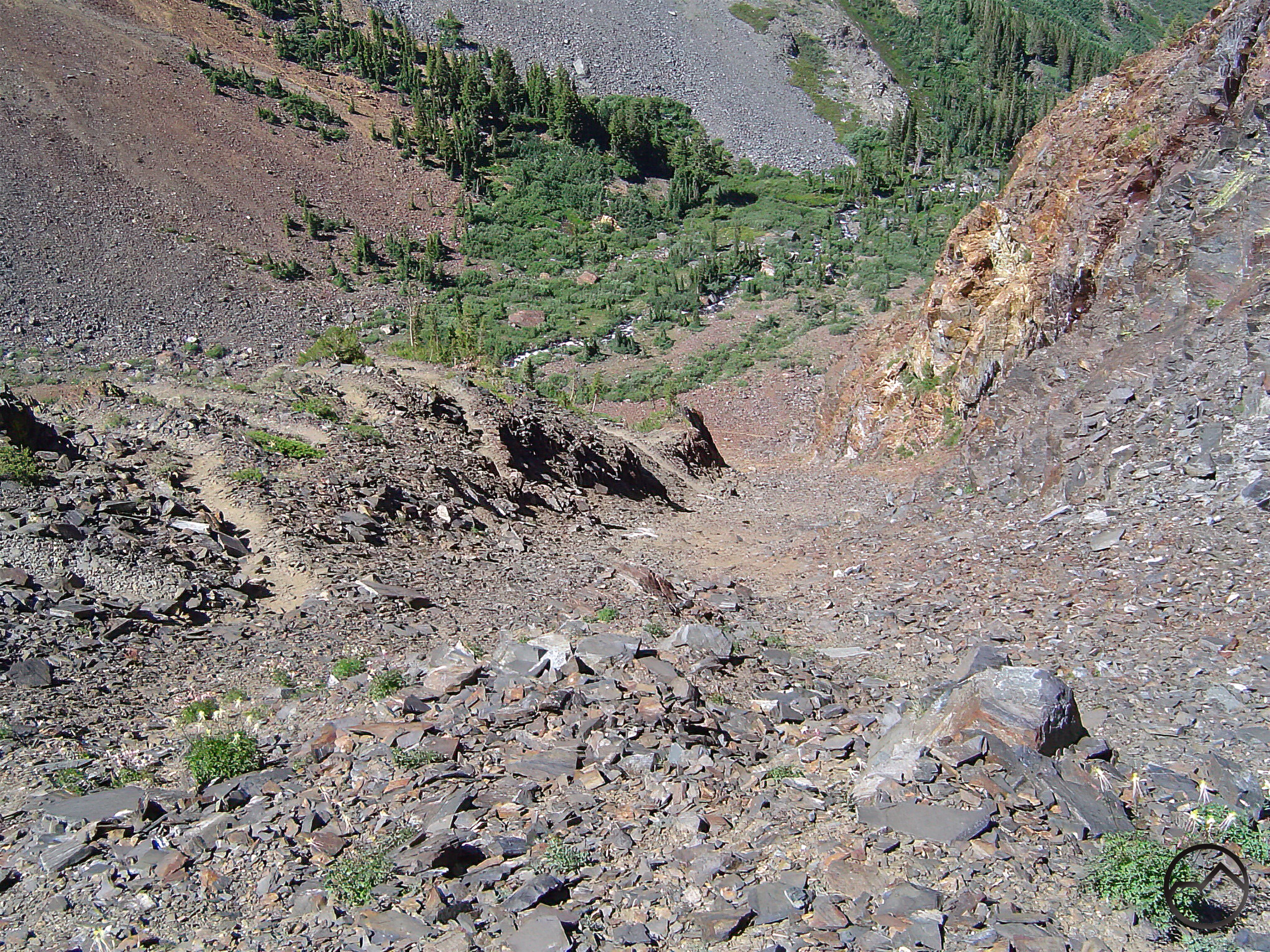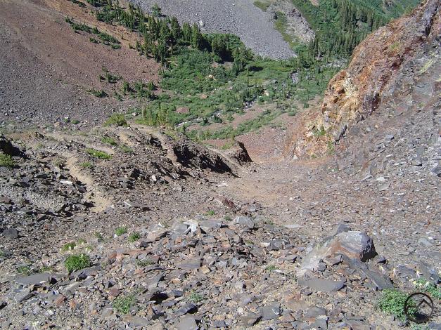 The trail eventually makes the ascent up the side of the canyon. The above image is taken halfway up, at the top of a series of switchbacks built into the talus slope. Though they are hard to discern here, there is indeed a path built out of the rock. This is the section that gave way and was lost.