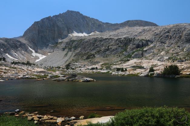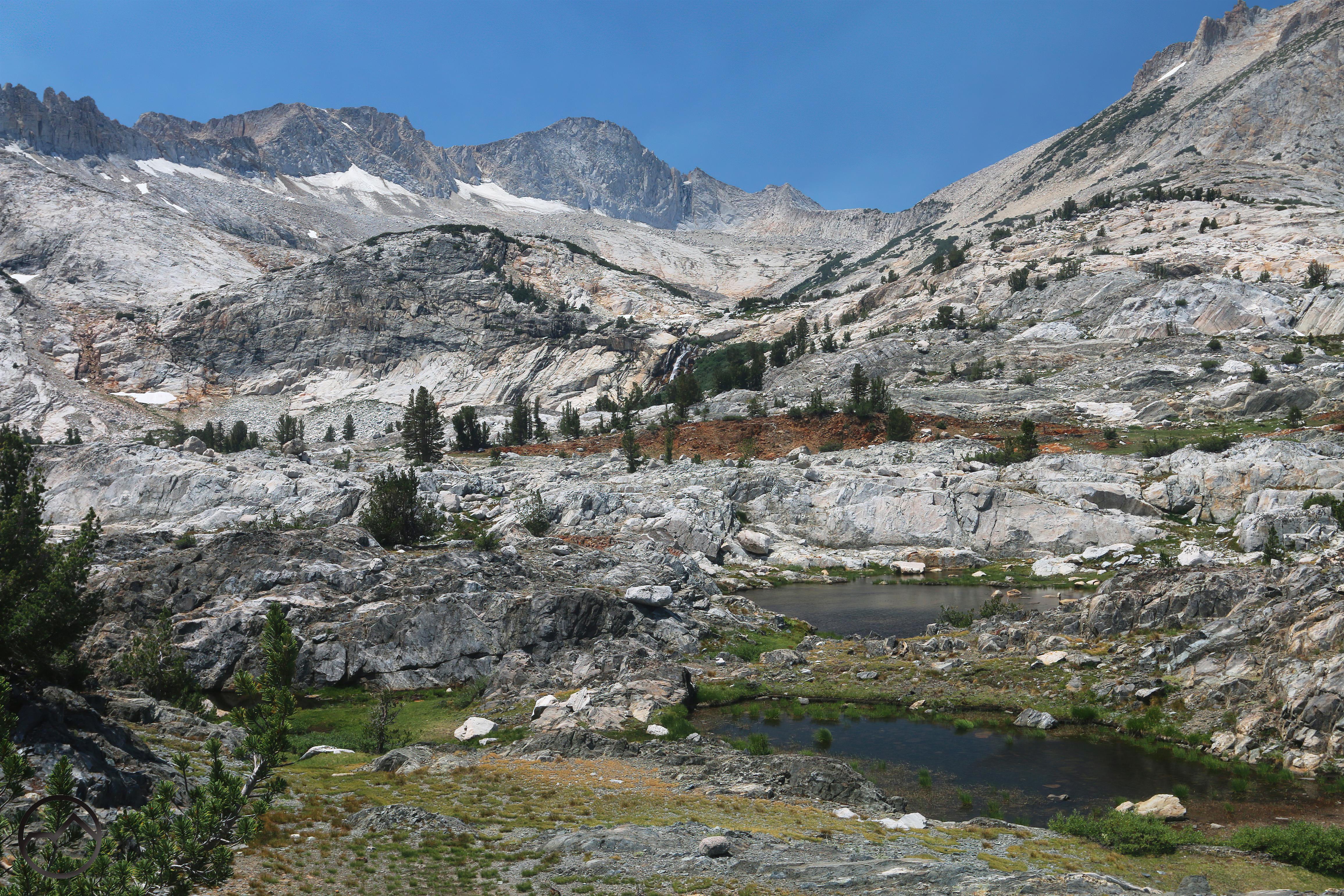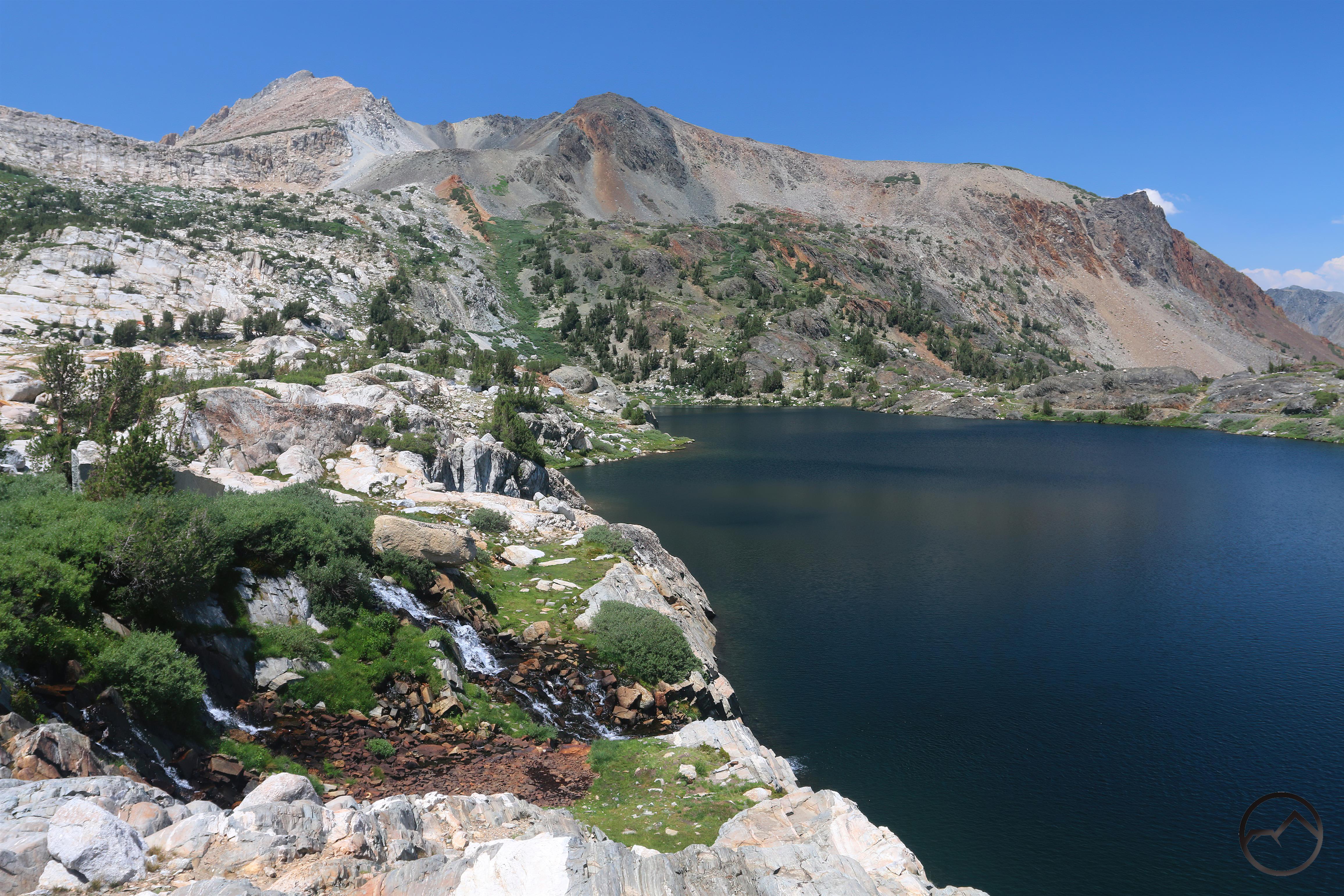 Once on top, the trail levels off and makes an incredible loop through the 20 Lakes Basin. Not only is there an abundance of lakes as one might guess, but there is an overabundance views of the northern end of the High Sierra. Located near treeline, the alpine vistas are rarely filtered by forests, but the loop offers ever changing perspectives and diverse geology. This (admittedly inferior) image, taken from Steelhead Lake, shows the transitions from the red sedimentary rocks on the far right to the gray metavolcanics in the center to the white granite on the left. It’s a stunning geologic mélange.