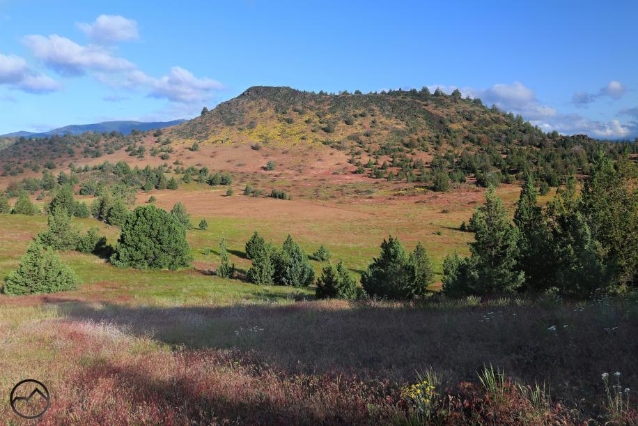 Cerro Pedernal rises above Tesuque Valley. The grass is thicker than it ever has been. The yellow of the wooly sunflower is evident.