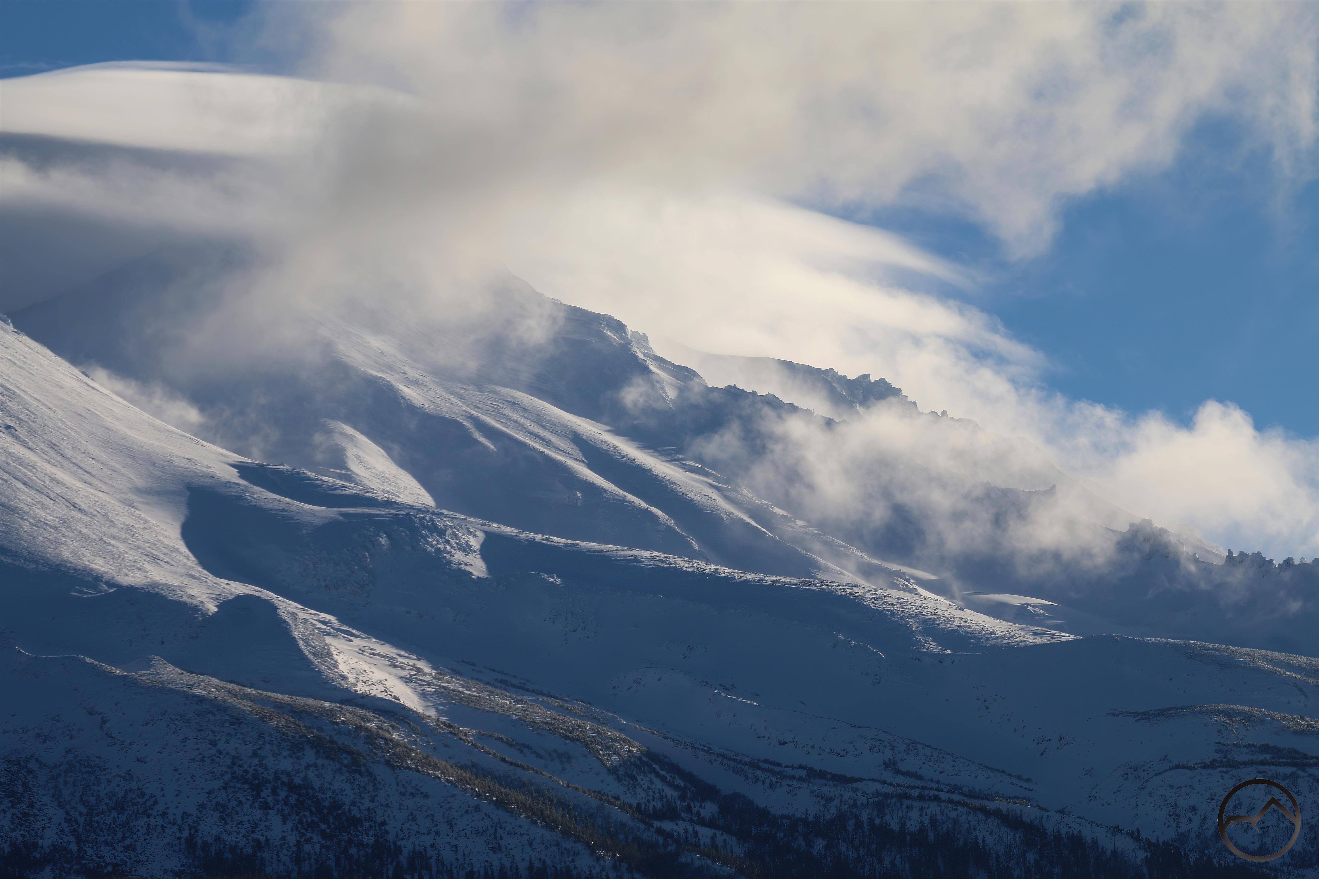 Things started off rather benign. The day before the storm, which was forecasted to leave 10 inches or so, was beautiful. The powerful winds that buffeted Mount Shasta were the only real indicator that the weather was in a state of considerable flux. Sunrise was beautiful, with the clouds swirling around the mountain and the sunlight reflecting off the recent snow.