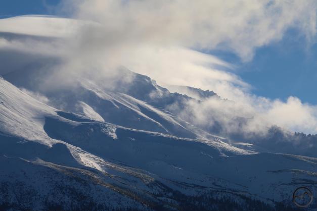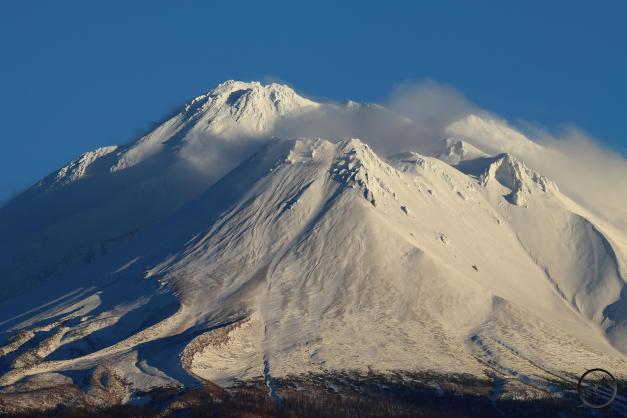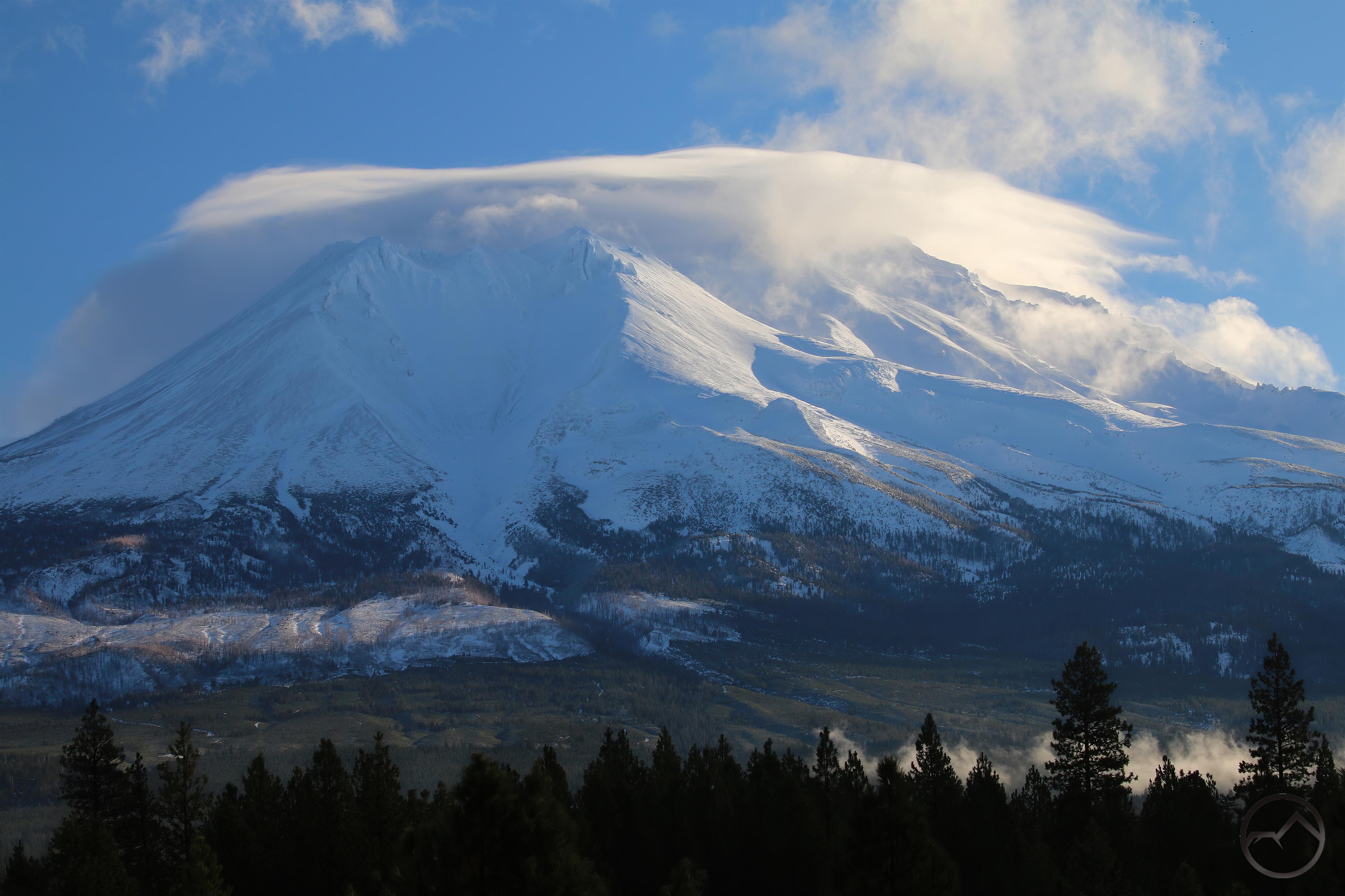 By the time I got back into town, the sun had swung far enough to the south that Mount Shasta was bathed in the glorious, autumn morning light. I love these kind of conditions on the mountain. All the details seem to pop and the entire mass of the volcano just seems to glow. However, the lenticulish clouds that formed around the summit were prophesying the incoming onslaught.