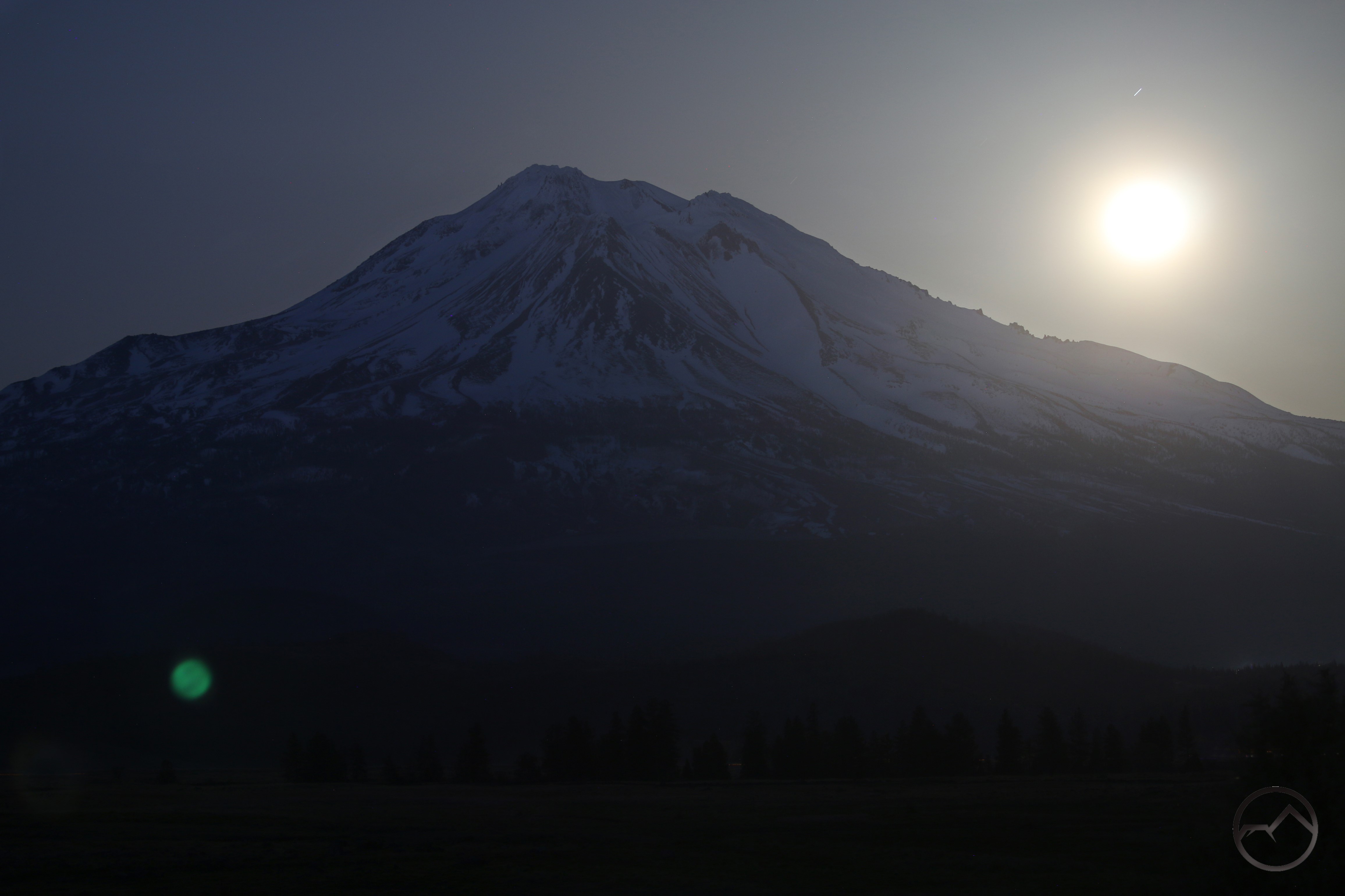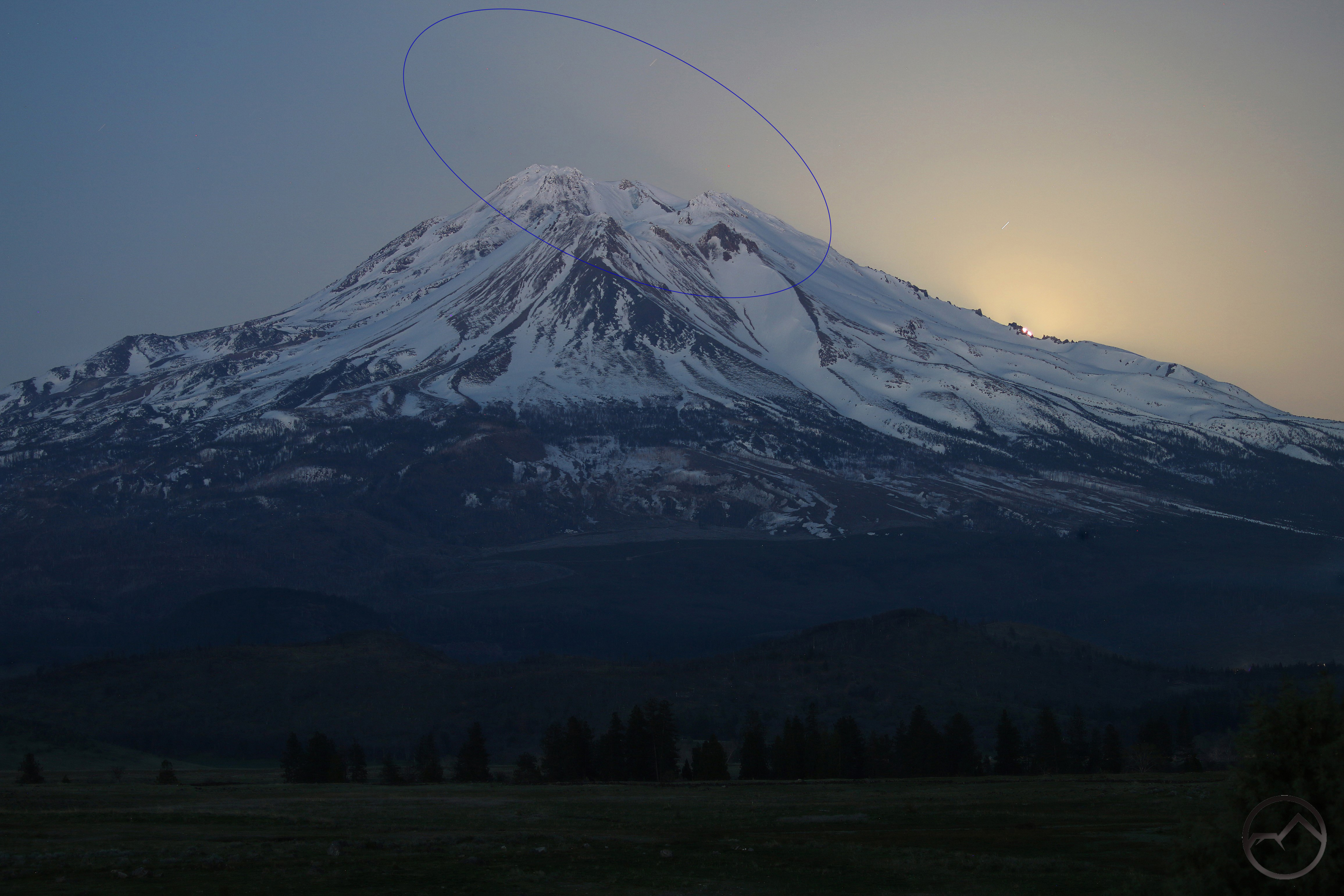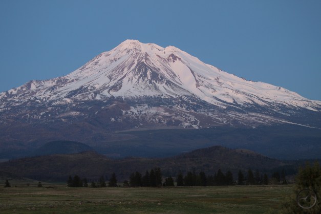 Sunset on Mount Shasta, seen from next to the arch on Cerro Pedernal.