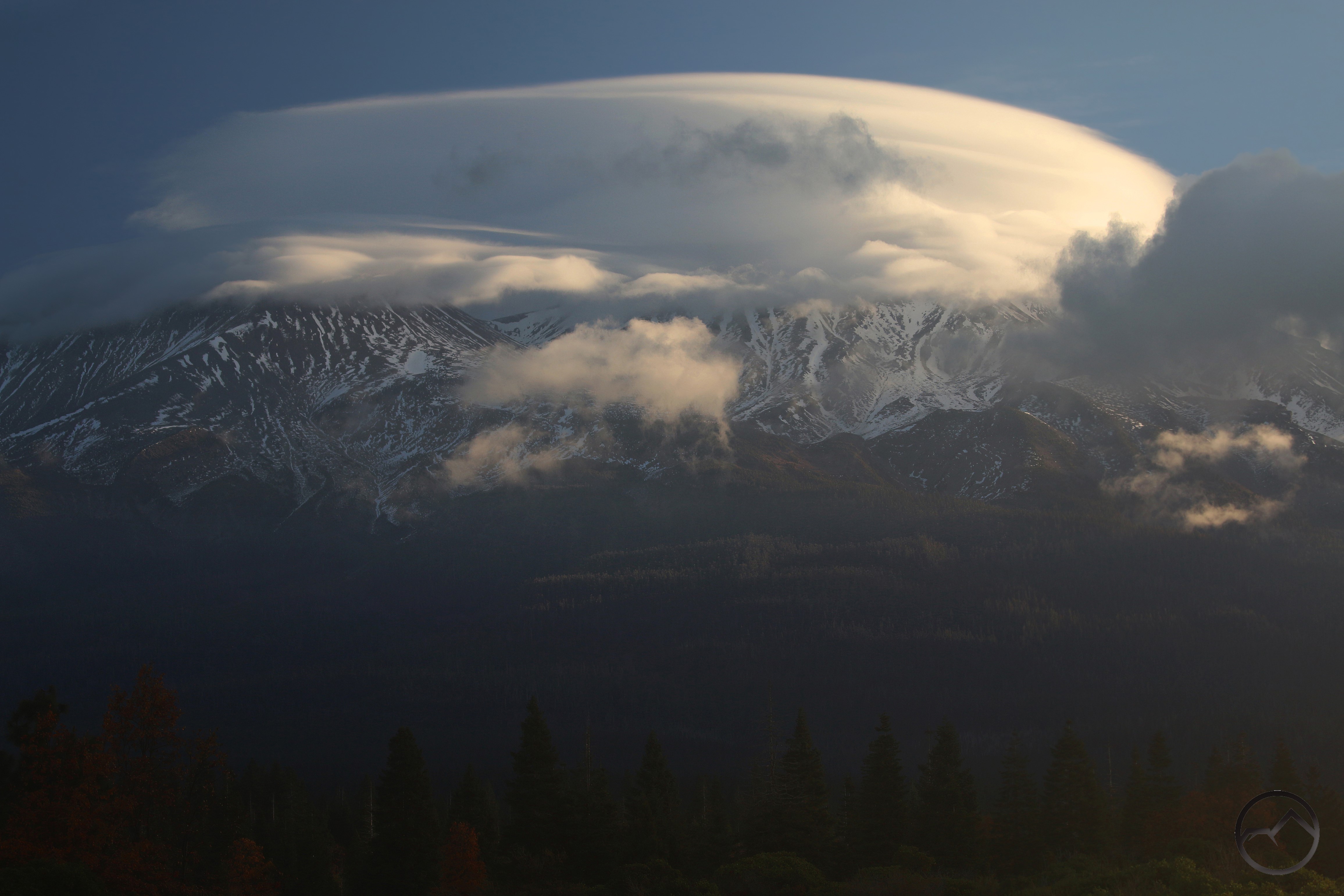 The sun finally climbed above the fog and for a brief moment the very top of Mount Shasta was visible above the god. The lenticular on the summit had grown even more but was soon swallowed up once again by the fog. Such was the nature of the morning.