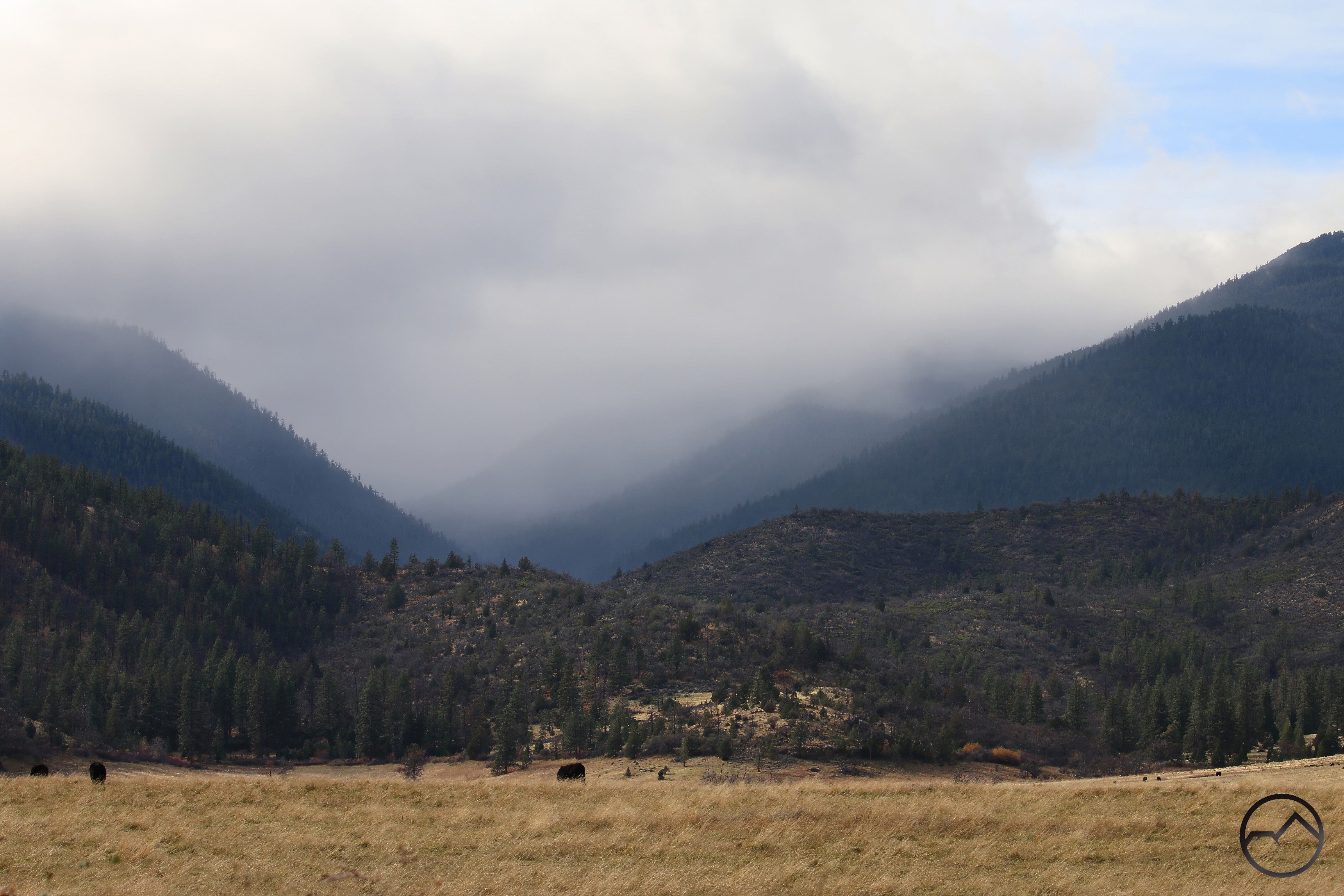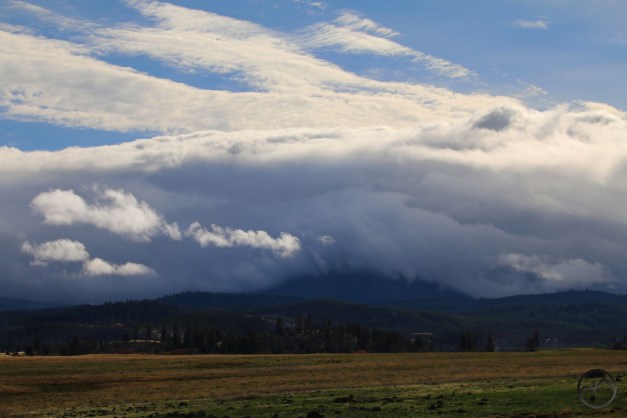 The rainshadow was obvious but equally dramatic. Only the base of Black Butte was visible in the midst of the swirling storm. It looked like a giant wave breaking and then dissipating into the desert of the Shasta Valley. Rain was visibly falling in the mountain canyons but it never really forced its way into the valley.