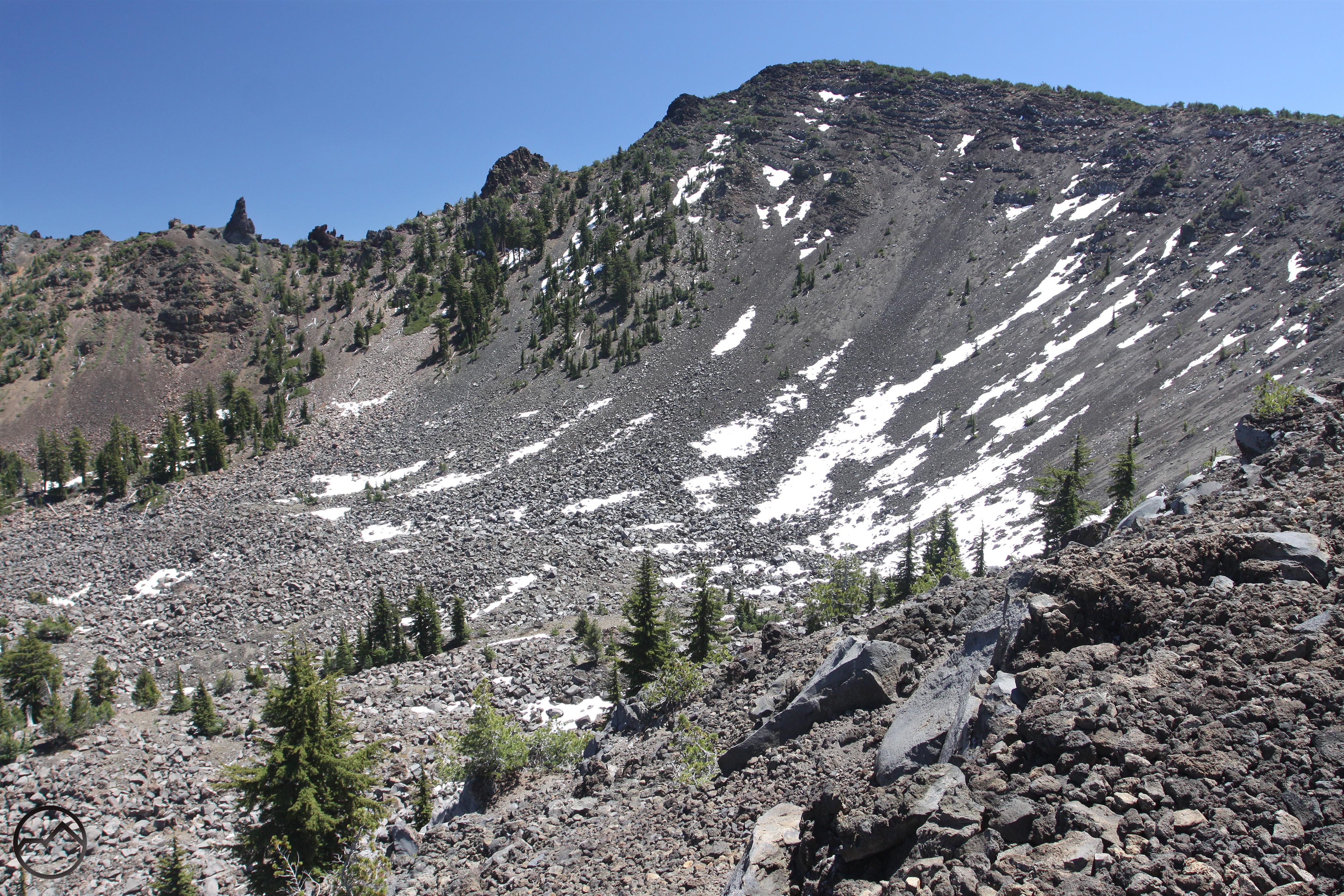 Once on the top of the ridge, the real adventure begins. For those who climbed through the clear cut, there is an old logging road at the top. Turn south and follow it until it fades out. Watch for cairns marking the route beyond the end of the road. If the preferred route was to climb straight up the ridge’s steep slope, it is likely that the route will hit the top of the ridge after the logging road has ended. If this is the case, turn south at the crest and begin climbing. Whichever route was followed, cairns will mark the way south and a faint path will soon be obvious. After a short distance, views into Ash Creek Butte’s massive north-facing cirque will open up and hikers will be able to gaze down onto the giant screefield. Though Ash Creek Butte is volcanic, this is not a crater. It was formed by heavy glaciation. A similar formation exists on the east side, though the cliffs below the summit are much higher and there is less talus. The summit rises impressively to the south, towering high above the rocky basin. The route from here is obvious: follow the ridgeline all the way to the summit.