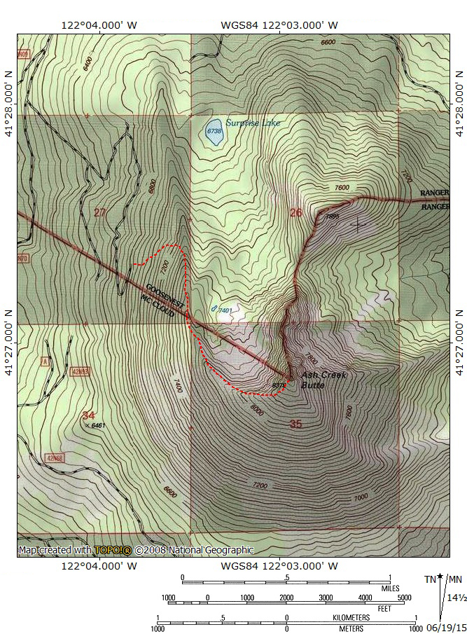 The east side of Mount Shasta is the most remote and forsaken side of the great mountain. Unseen from highway or community, it is often a great blank spot on the mental map of the mountain’s aficionados. Its obscurity extends beyond the Mount Shasta itself and envelopes the surrounding peaks and valleys of the Cascade Range. Rising prominently above this unappreciated tangle of ridges, meadows and deep forests is Ash Creek Butte, one of the tallest and most interesting peaks in the Mount Shasta area. In an area where the mountains are generally rounded summits, Ash Creek Butte is notable for its break with the area’s template. Massive craggy rock outcroppings, tall rocky cliffs and a towering summit jutting into the sky are some of this awesome mountain’s characteristics. Yet, despite the great beauty, fascinating geology and incredible views of the surrounding region, Ash Creek Butte remains off the beaten path. Despite the obscurity, this is classic Cascades terrain, with lots of exposed volcanic layers, tall, rugged peaks, lakes (though these do not lie on the route to the top), hoodoos and views of a gargantuan stratovolcano. This does come as a price though. The trip to the top of Ash Creek Butte has no trail. There is a use-trail, but it is faint and unmaintained. For experienced hikers, these should not pose problems and the scramble to the top of the mountain is one of the finest summit ascents, and best views, in the Mount Shasta area.
