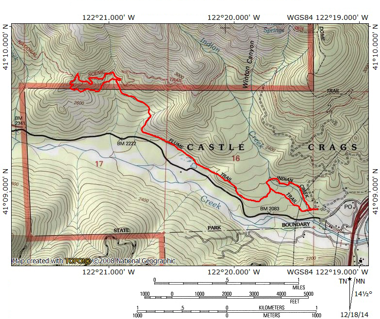 Near the junction is small Dump Creek. The first few yards of the trail pass the creek but a pair of switchbacks soon leads you away from the water. Join the PCT at the top of the switchbacks and turn left. The trail quickly crosses over the creek and begins to climb out of the small drainage. Nearly 0.3 miles from the creek the PCT climbs up out of a small gully and makes a tight, hairpin turn. Look to the north for a fantastic view of the imposing granite cliffs of the Castle Crags. These peaks seem like misplaced towers of the Sierra Nevada. Another 0.15 miles further brings you to another junction. Turn left to return to the Flume Trail. The path climbs up to the top of a knoll where a short, easy scramble over small rocks leads to an awesome overlook above Castle Creek. The creek can be seen and heard crashing through the canyon 700 feet below. To the east, wooded Girard Ridge rises above the canyon of the Sacramento River. To the west the mysterious Grey Rocks stand guard over the region. From the overlook the trail begins to descend, making several switchbacks down a remote, rarely traveled hillside. The trail crosses Dump Creek and arrives at the junction at the beginning of the loop 0.6 miles after leaving the overlook. From there, hike back along the Flume Trail for 1.75 miles to the junction with the Indian Creek Nature Trail. This time, turn right and hike the second half of the little loop. The path travels through the woods with a brief open spot that has a nice view of the Castle Crags. It then descends down to Indian Creek and crosses over an unusual but very scenic bridge. This spot on Indian Creek is one of the prettiest on the entire hike and makes a good place to sit and put your feet in the water. Beyond the creek it is only 0.1 miles back to the trailhead.