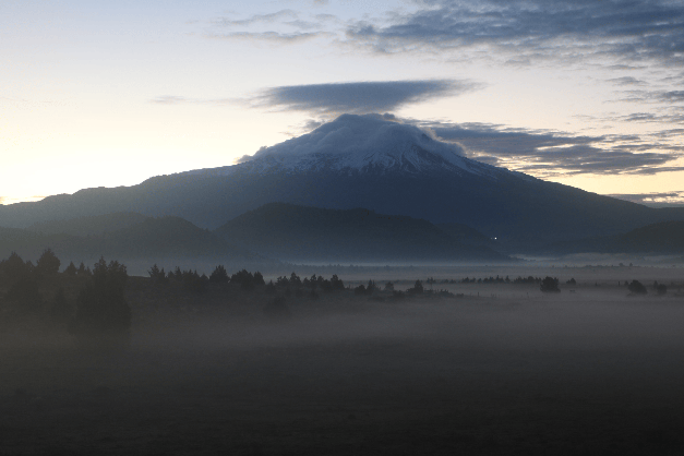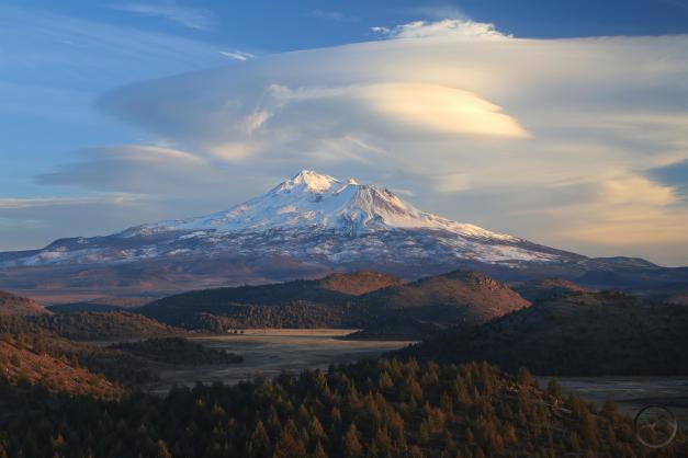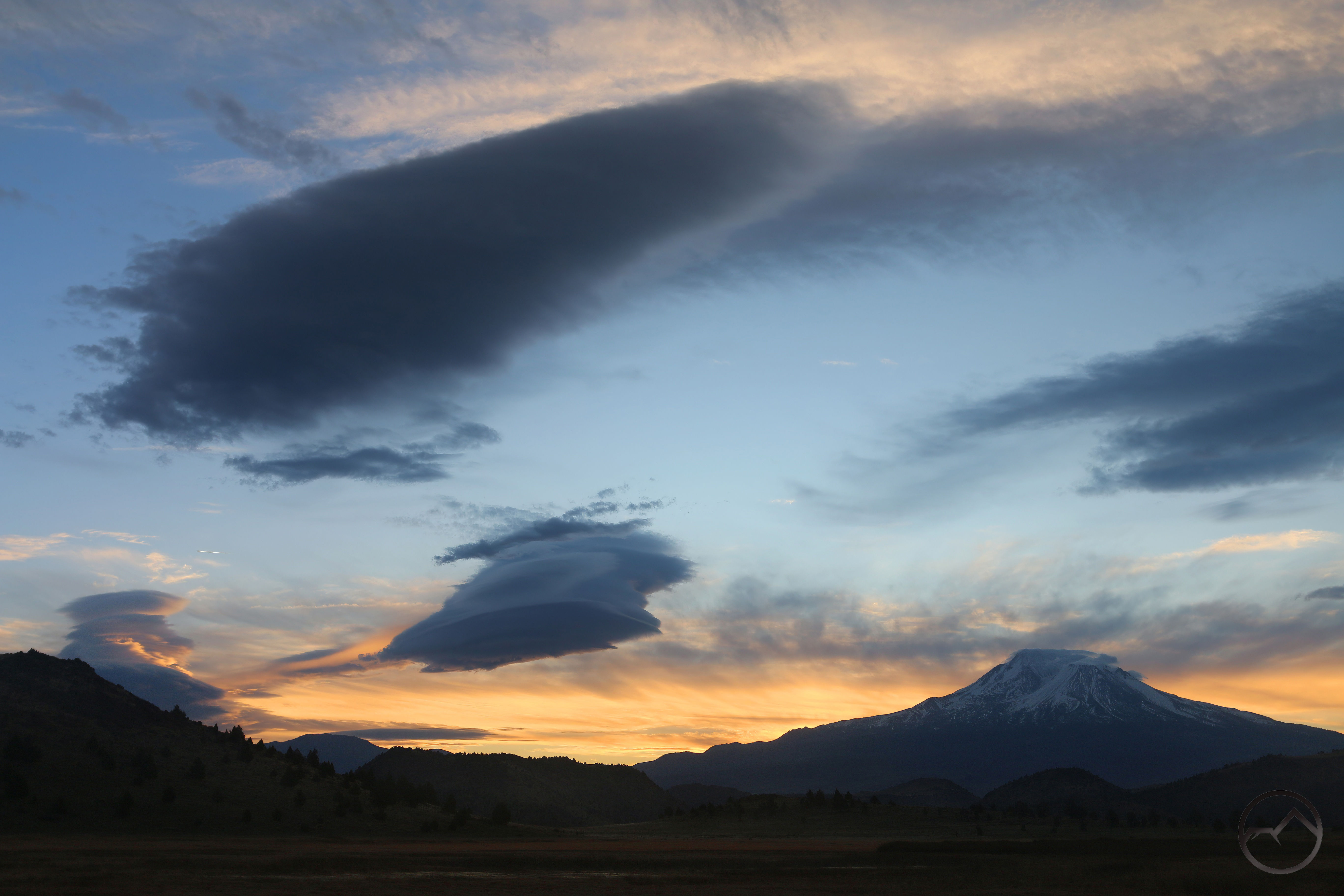 A lenticular cloud emerges over Mount Shasta at sunset.