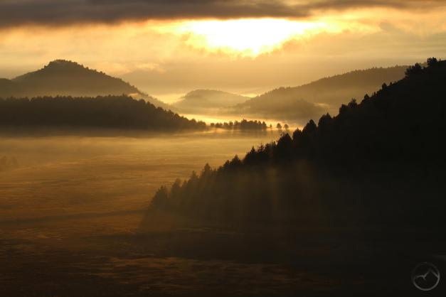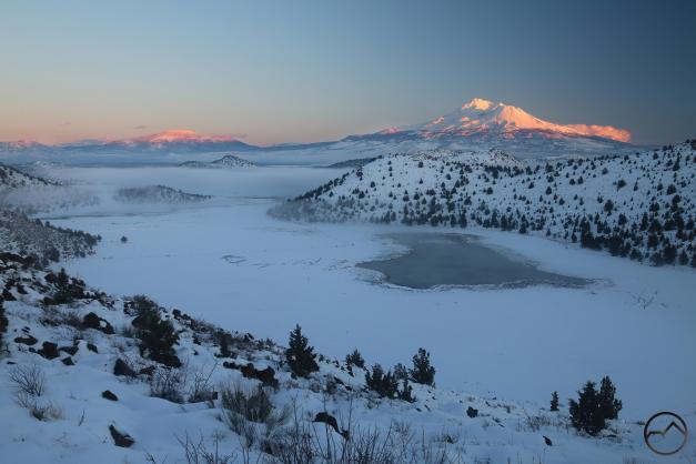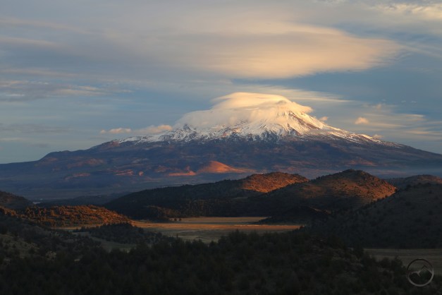 The next day dawned with another lenticular. The sky was blanketed with clouds. This was the makings for a colorful sunset so, once again, I dragged myself out of bed earlier than I wanted to. To my dismay, the clouds sailed off to the south as I drove north, leaving little in the sky to catch the color. The lenticular remained, though it too was diminished in size from what it had been when I got up. Nonetheless, the flow of the fog through the Shasta Valley made the morning interesting. It all seems so…respiratory. I am not sure what mythic creature’s breathing causes this phenomenon though.