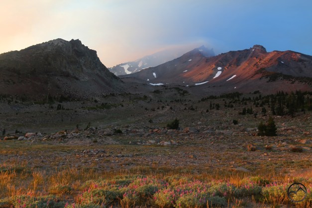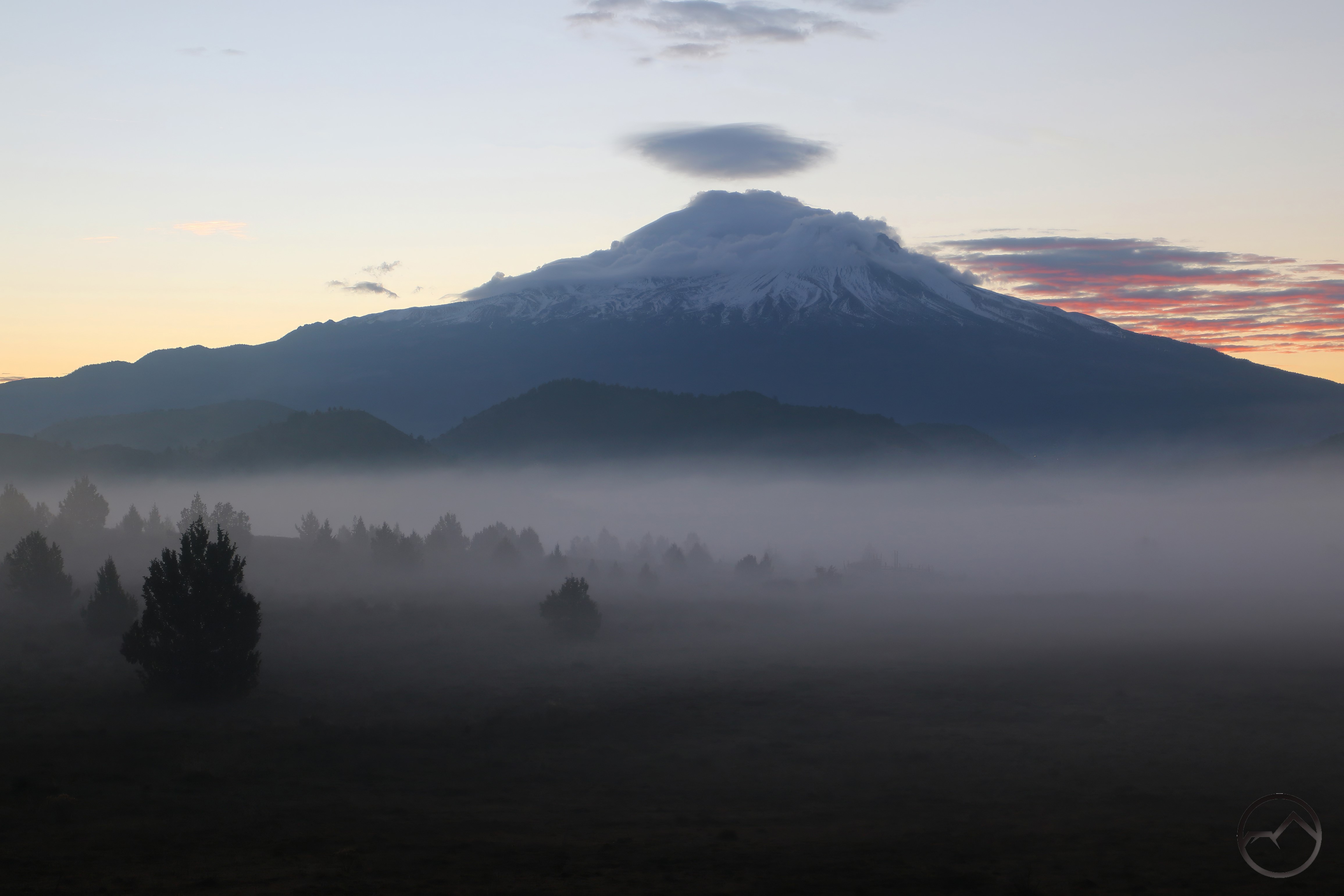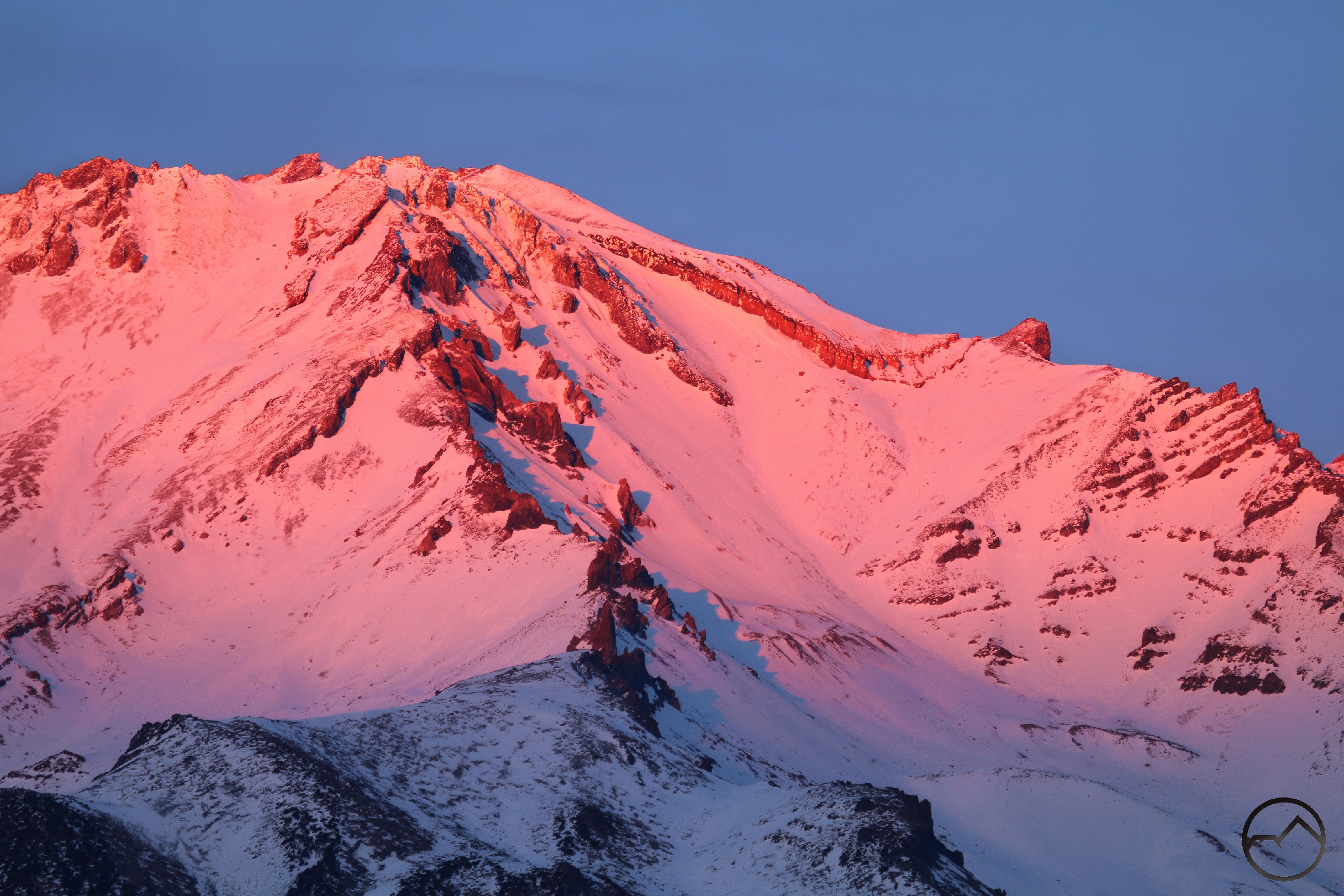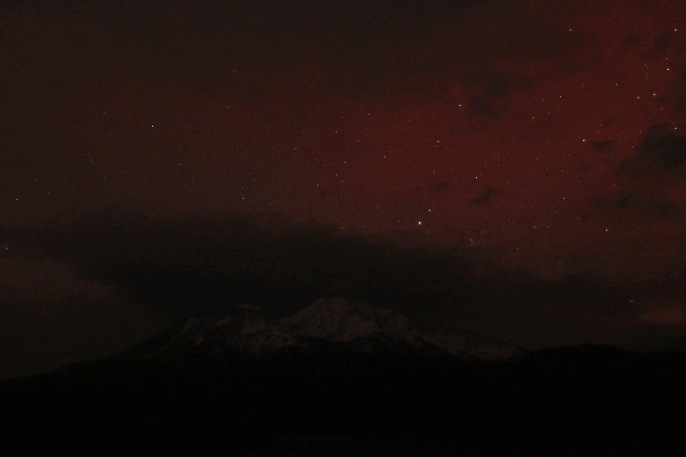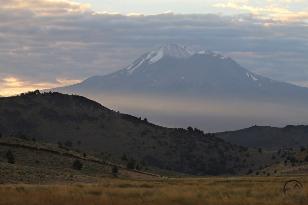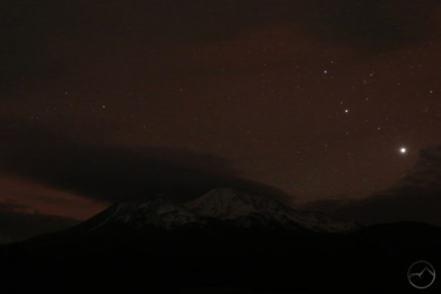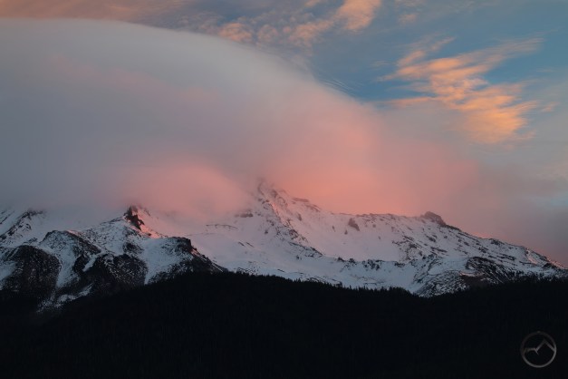 By morning the cloud had grown and was covering the entire summit area of Mount Shasta. These are the least interesting formations on the mountain. They lack distinct layers and cover the terrain, leaving just a blob where there should be a mountain. Still, it did glow as the sun came up.