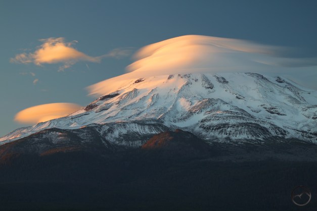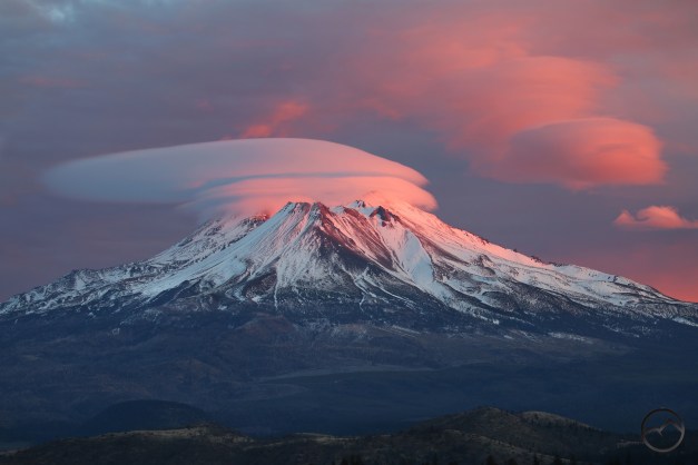 The first lenticular formation came the day after the massive one that closed out November. This one caught be off guard. I was not anticipating it as it had been fairly clear all day but when I was taking my kids to one of their events, I noticed the activity over Mount Shasta and had to stop and get a shot of the mountain. The color at sunset was fantastic and the layers on the stack over the mountain’s summit were very distinct. A secondary cloud tried forming to the south but couldn’t muster the strength to really pull itself together. It still caught the alpenglow in spectacular fashion!