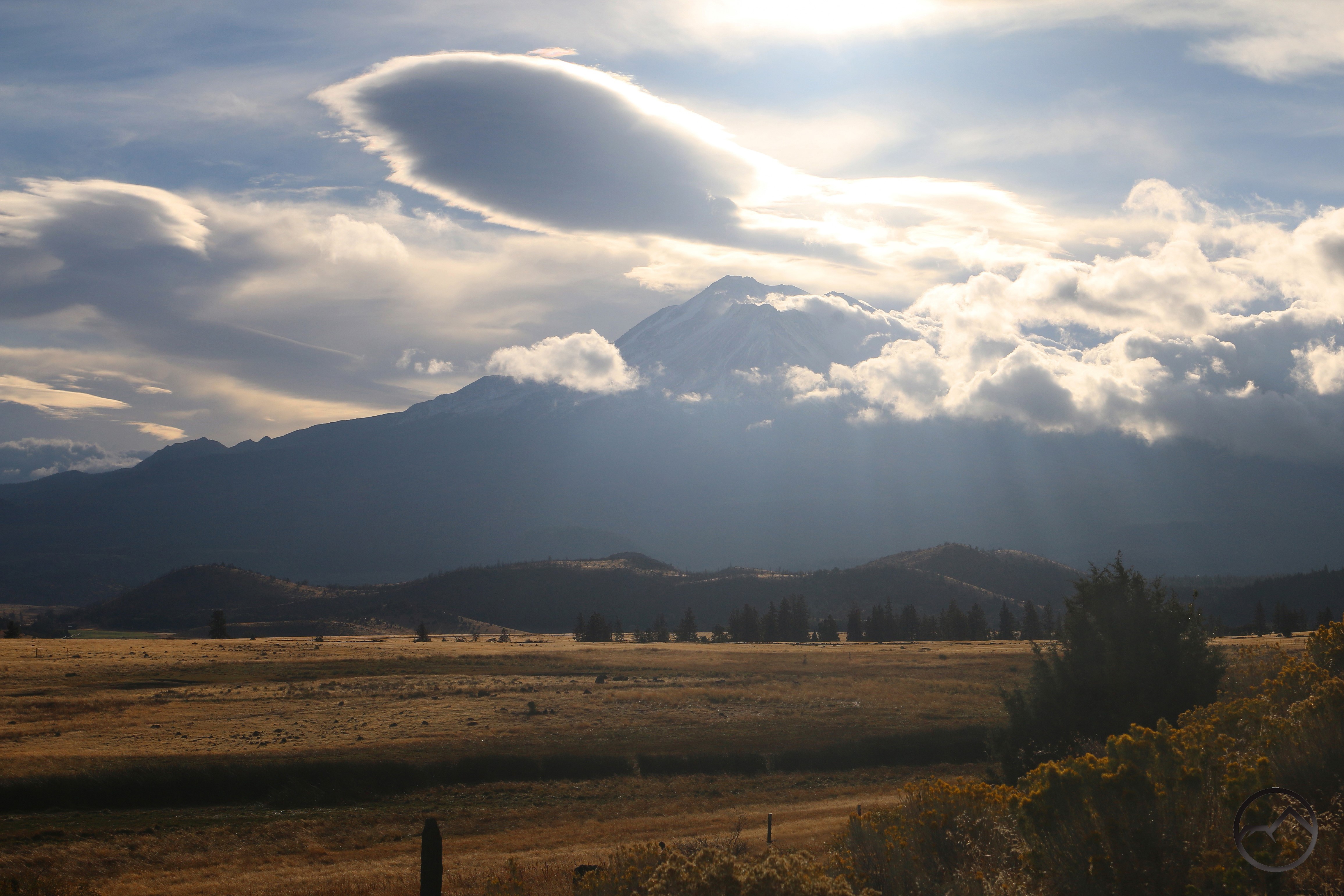 The time lapse shows how tenacious the lenticular was, clinging to Mount Shasta all day, even when the clouds seemed it overwhelm it as they sailed by. When they were gone, it was still there. Also, I love how the light breaks through the clouds and travels over the hills of the Shasta Valley.