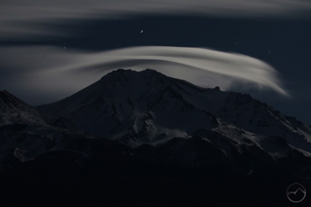 That night, as my wife and I drove home from the animal hospital’s Christmas party, the lenticular still hung over Mount Shasta. It was backlit by the rising moon, which gave it an eerie glow in the dark night. We stopped and took a few shots, hoping to capture some of the glittering in front of us. It was a great end to a the most beautiful week I have seen around Mount Shasta in some time. Little did I know the best was yet to come…