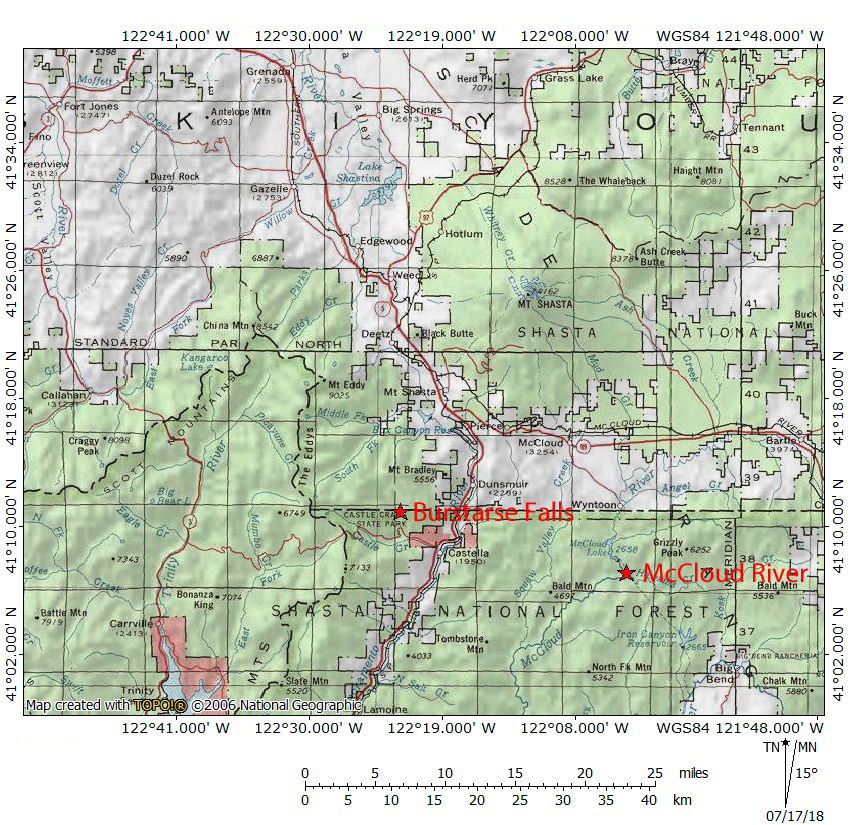 In some ways, recognizing Castle Dome and the Castle Crags in the image is easy. The particular giveaway is the shape of Castle Dome. The peak appears quite differently depending on which angle one views it. However, it is obvious that Dana was looking at the dome and the rest of the peak from somewhere near Root Creek. It seems likely to me that it was near that creek’s confluence with the Sacramento River. The shape of the peak from that perspective in unmistakable.