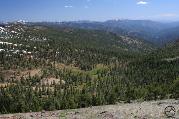 The view from above Caldwell Lakes, looking down the upper course of Parks Creek, into the higher section of the canyon. The distant Shasta Valley, the ultimate destination of Parks Creek, can be seen below.