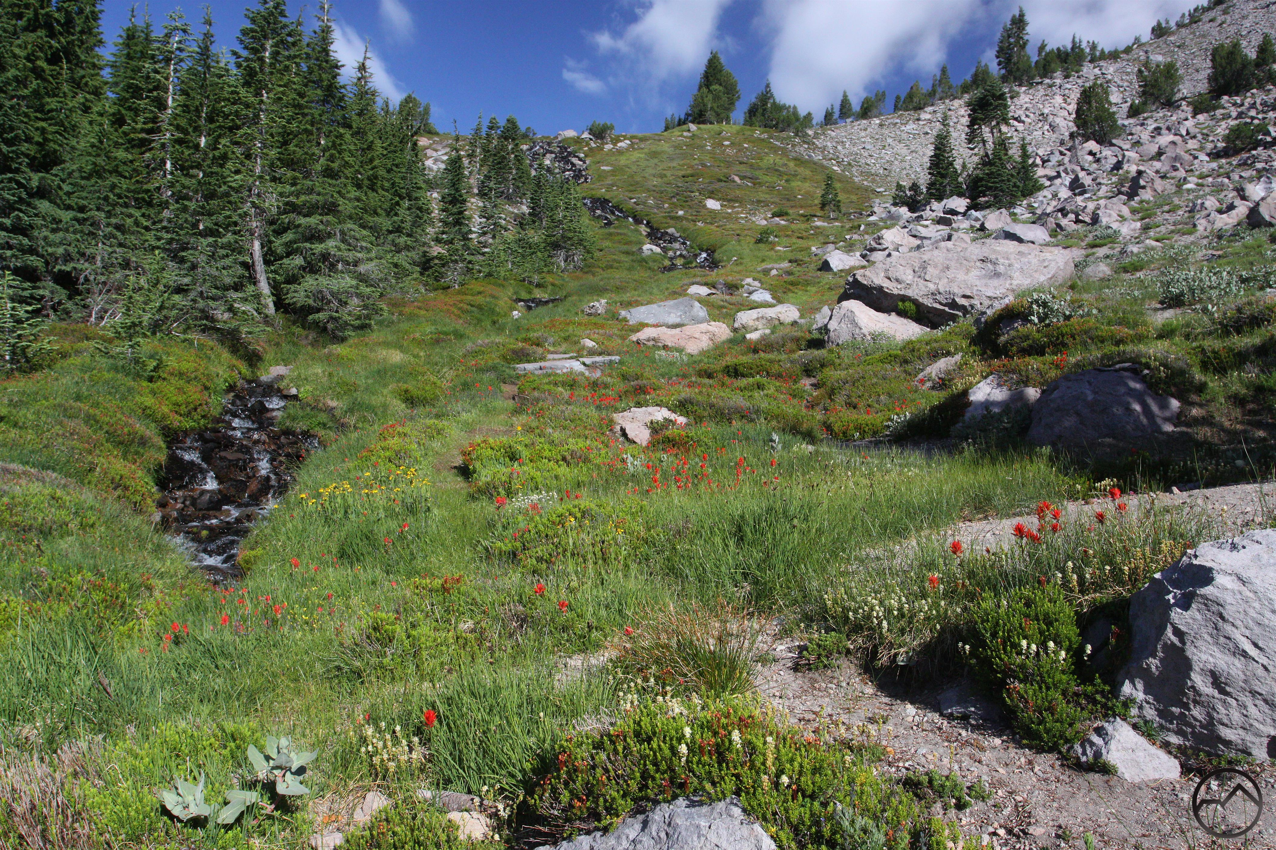 While journeying toward Parks Creek, numerous cascades and small waterfalls highlight these early tributaries. Though often dry by midsummer, they are a fantastic place to explore in the spring.