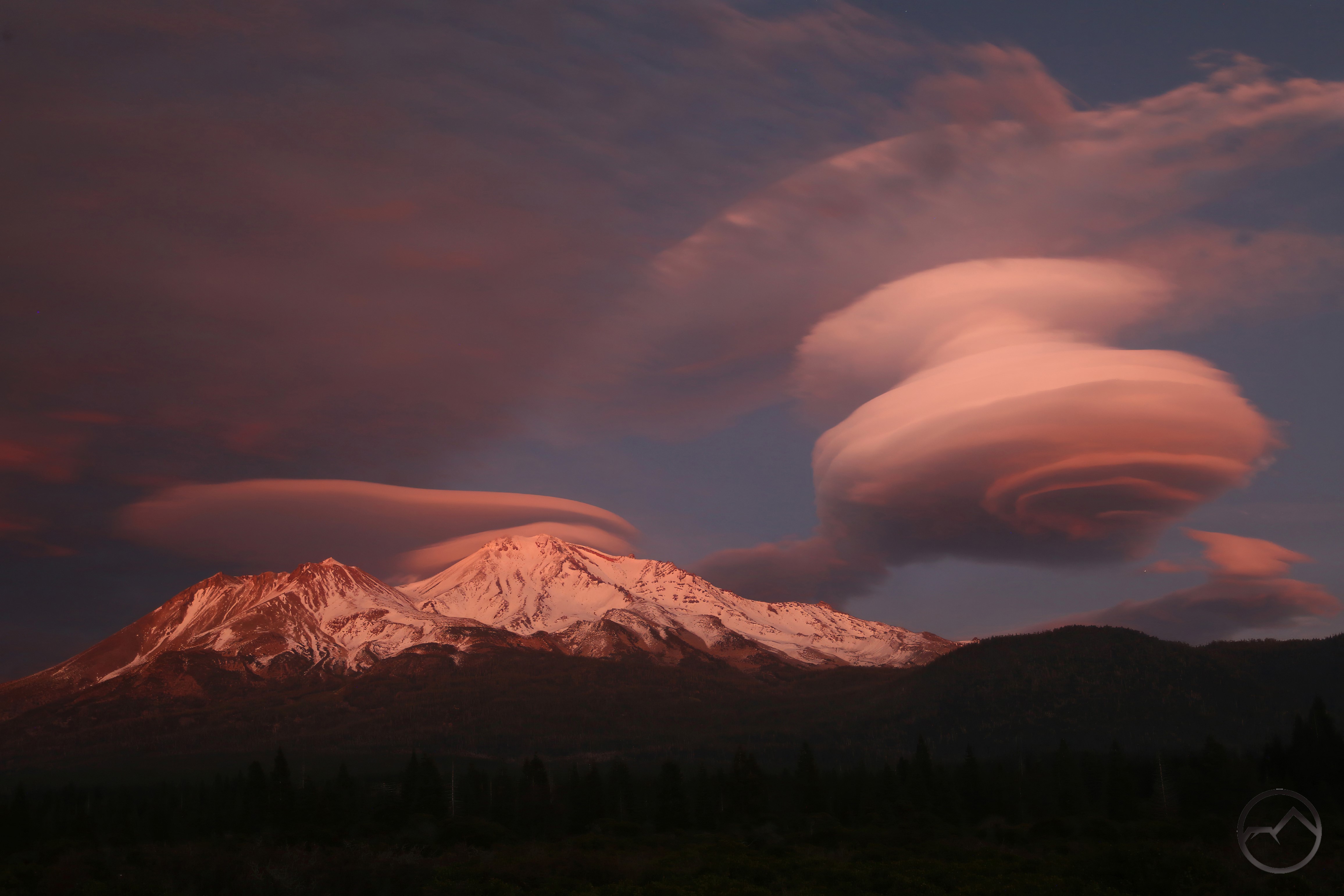 Snow this deep rarely falls in the Shasta Valley. However, it highlights Parks Creek as it flows through its rarely seen vale. The creek is visible middle left, just below the fog line. It has melted the snow as it flows through the vast meadow. The nearby lake is only connected to Parks Creek at the highest water of the year, otherwise it is isolated from the rest of the creek’s watershed.
