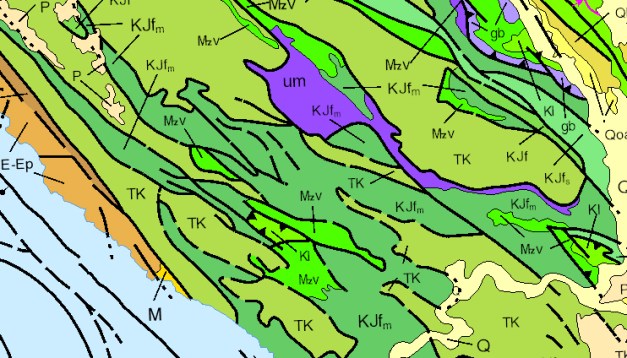 A rough outline of Sonoma County on the geologic map of California. The green areas are composed of sedimentary rock. The yellow is alluvium. The red areas are volcanic mountains.