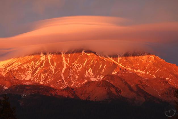 After closing the lot up no long before sunset, I headed home. The Christmas tree sales interruption now over, I would have tried to go immediately to get images of the lenticular blazing with the colors of alpenglow but I was in my truck, towing my large trailer I had been using to restock the tree lot. It wasn’t conducive to chasing images of the mountain and cloud. I did force myself to stop and just capture an image from the road for posterity. The lenticular wasn’t as large as it had been but it still presented a fascinating view.