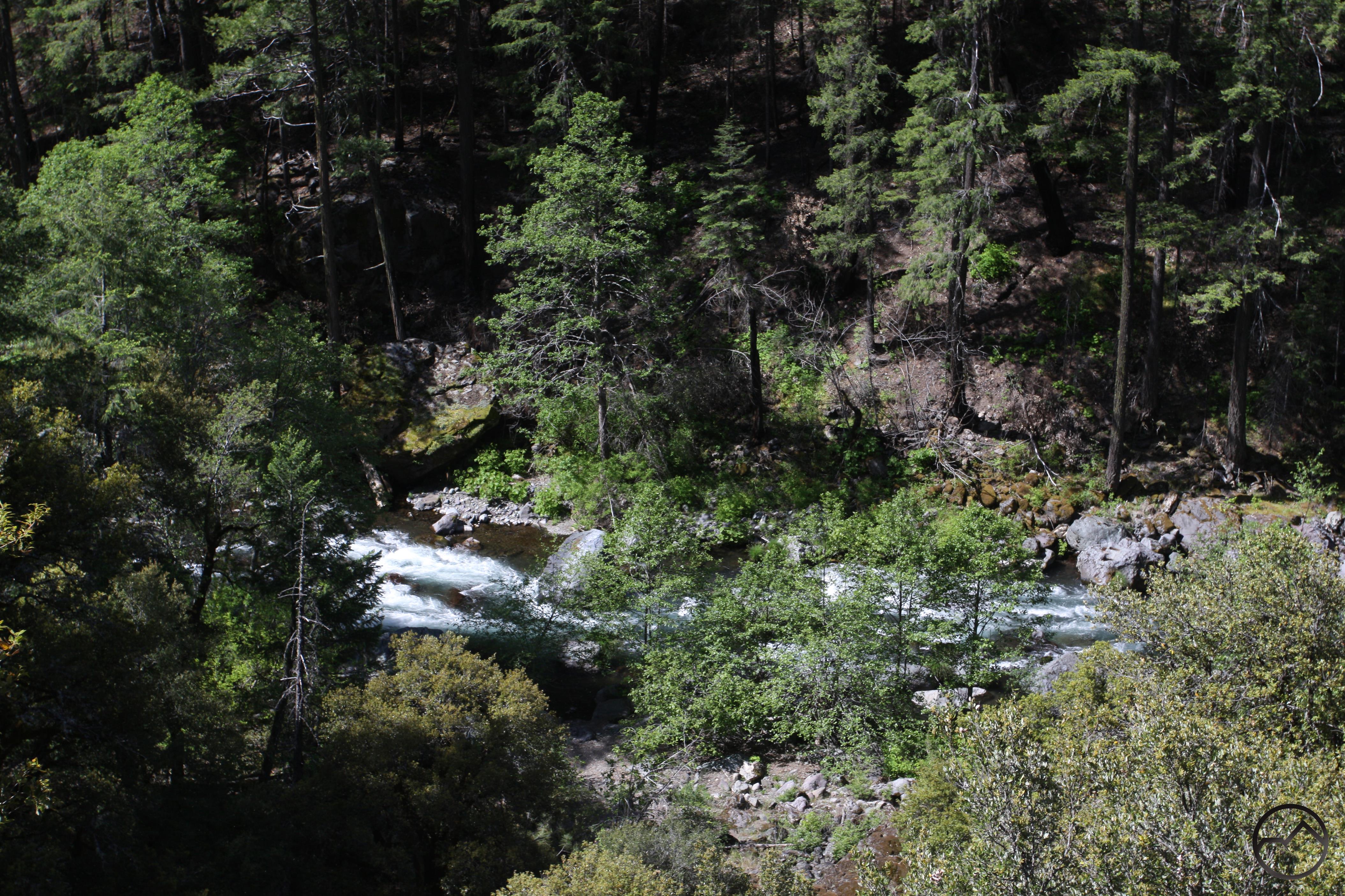 Continuing on the PCT, the trail is slung across the steep slopes that plunge down to the bottom of the canyon. There is little room for exploration off of the trail and what opportunities are available are discouraged by the presence of poison oak. Thick stands of oak, ponderosa pine and douglas fir are ubiquitous and are generally to blame for the lack of views down to the water. Hearing it roar makes it feel tantalizingly close but still out of reach. Nonetheless, when a chance to see it does pop up, it is quite a sight since it is a particularly wild and violent section of the river. About 0.95 miles from Ash Camp there is an obvious use trail that descends very steeply down to the water. For hikers looking for an impressive example of the kind of rapids on this section of the McCloud, this is a good opportunity to observe one of the river’s larger cataracts. A band of massive boulders runs across the entire width of the river, forcing the water to pour over a 10 foot drop by means of a series of cascades and small plunges. The fury of the water forcing its way through the rocks is inspiring.