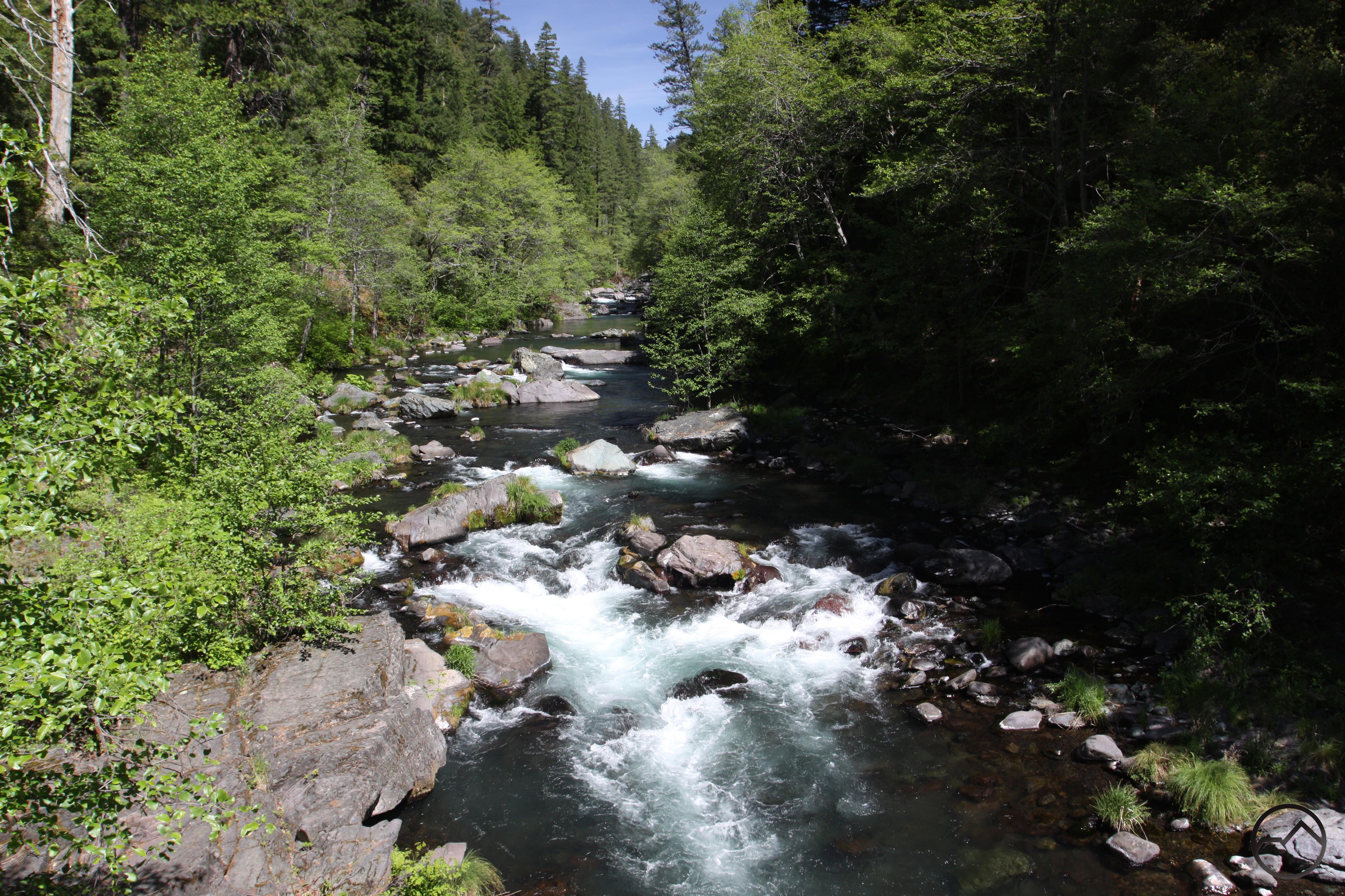 About 0.1 miles from the bridge the trail makes a turn to the west, beginning the PCT’s westward trajectory for the duration of the hike. The river, however continues to the south, making a longer horseshoe bend to the west. While the trail and the river are separated the river is still quite audible. Large old-growth trees abound along the trail and the forest’s understory nearly surrounds the path in some places. Be sure to look for well-established use trails branching off to the left from the main trail. These lead down to the river as it is making its wide turn. The river is at one of its most scenic manifestations along this stretch and it is worth the time to head down to the water’s edge. When the river and trail finally regain their parallel orientation, there are some fine views down to the water roaring a couple hundred feet below the path. There is another use trail along this section that leads down a nice campsite adjacent to some excellent whitewater.