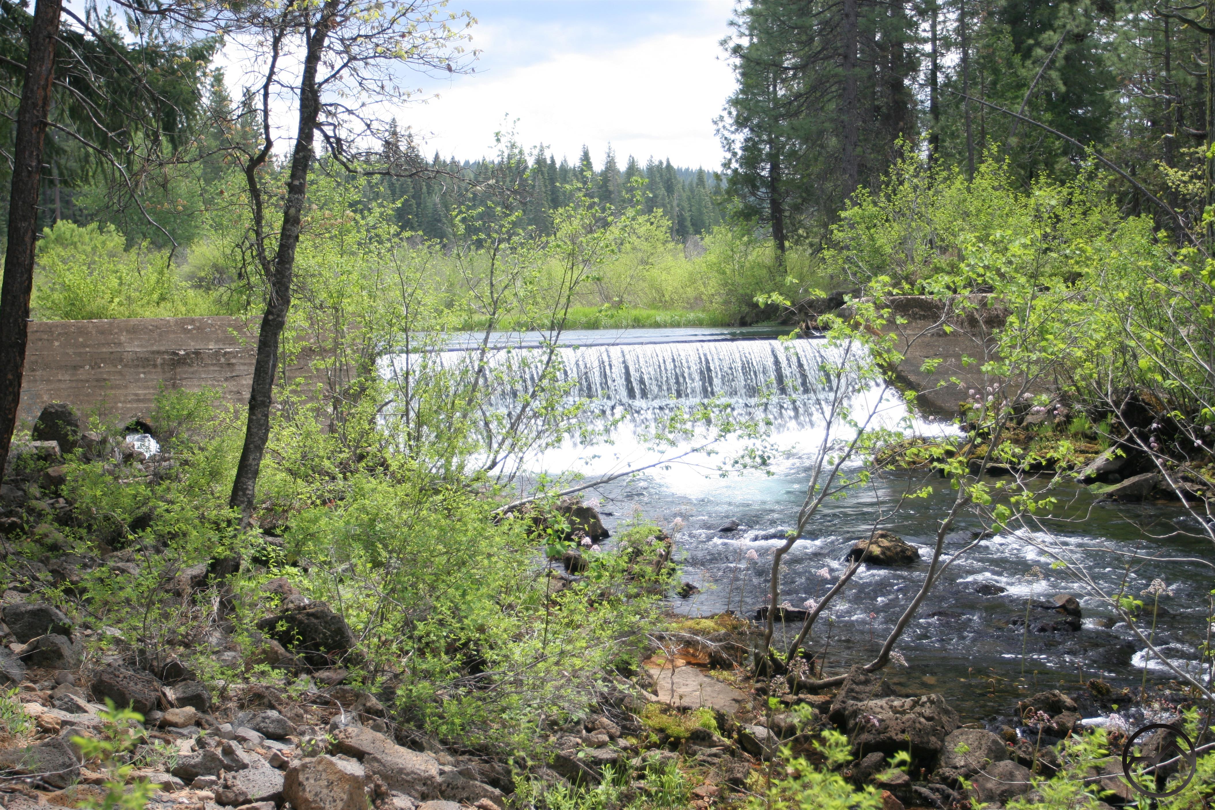 A short distance upstream from the dam, there is another picnic area. Built to draw people to see Lakin Dam, it is seldom used. This is a shame because the area is very different from the areas around the three waterfalls. Rather than extensive volcanic features and a roaring river, the area beyond the Lakin Dam is very pastoral. The river is lackadaisical as flows quietly through large Bigelow Meadow. The trail continues past the picnic area and follows the river along the perimeter of the meadow. From this point on the trail receives even less use. The bulk of the meadow is inaccessible from the trail. Furthermore, the portion of the meadow in close proximity to the trail is often choked with brush. It is possible to follow the trail for another 0.9 miles to where it intersects a dirt road as it crosses a bridge over the river. If one is deadest on getting to some nicer meadows, cross the bridge and follow the road for 0.5 miles. At that point depart the road and bushwhack to the west. Eventually this route will lead to some extensive grassy areas. This may seem a bit too far for most and the Lakin Dam area makes a good point to turn around and head back to the Lower Falls trailhead.