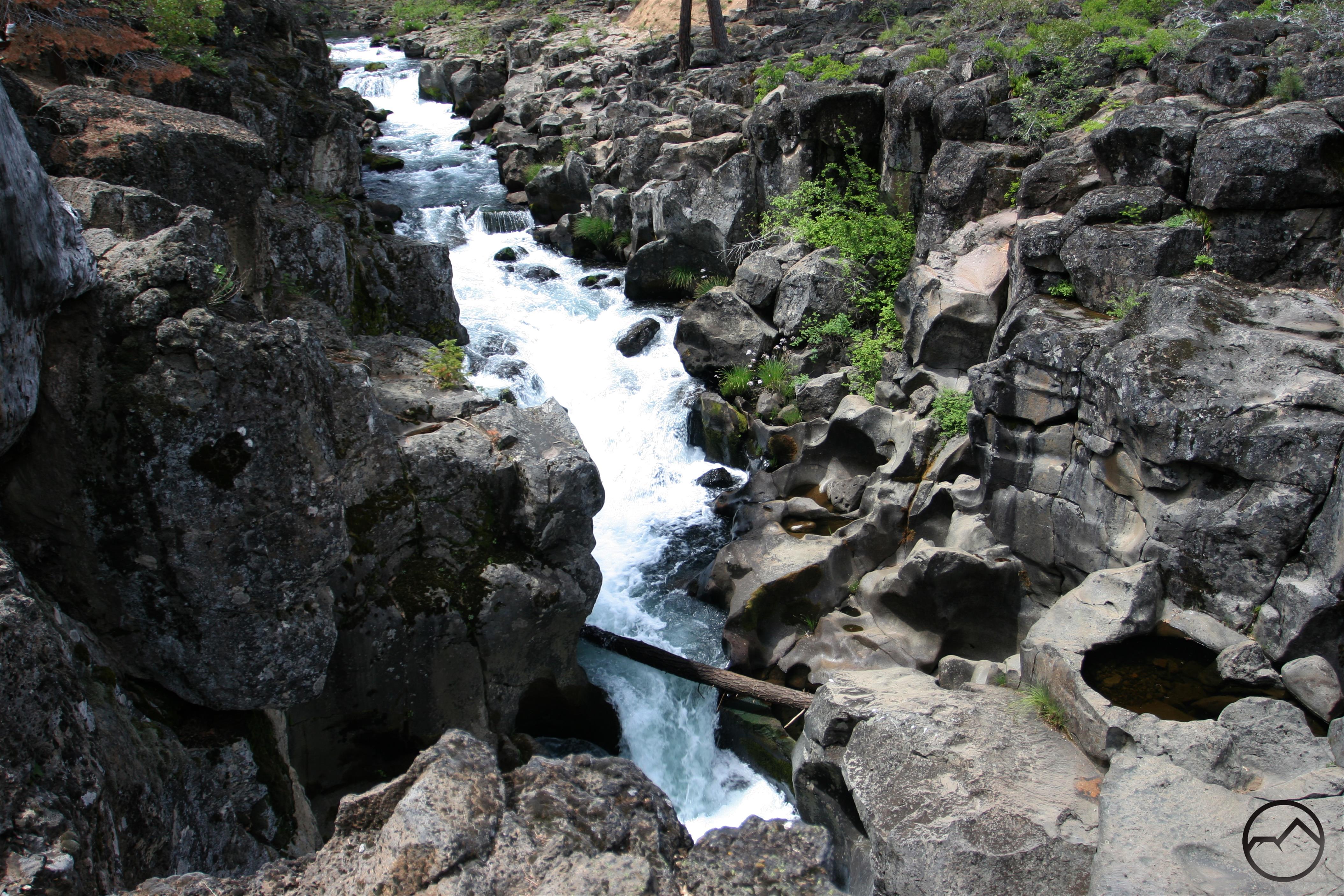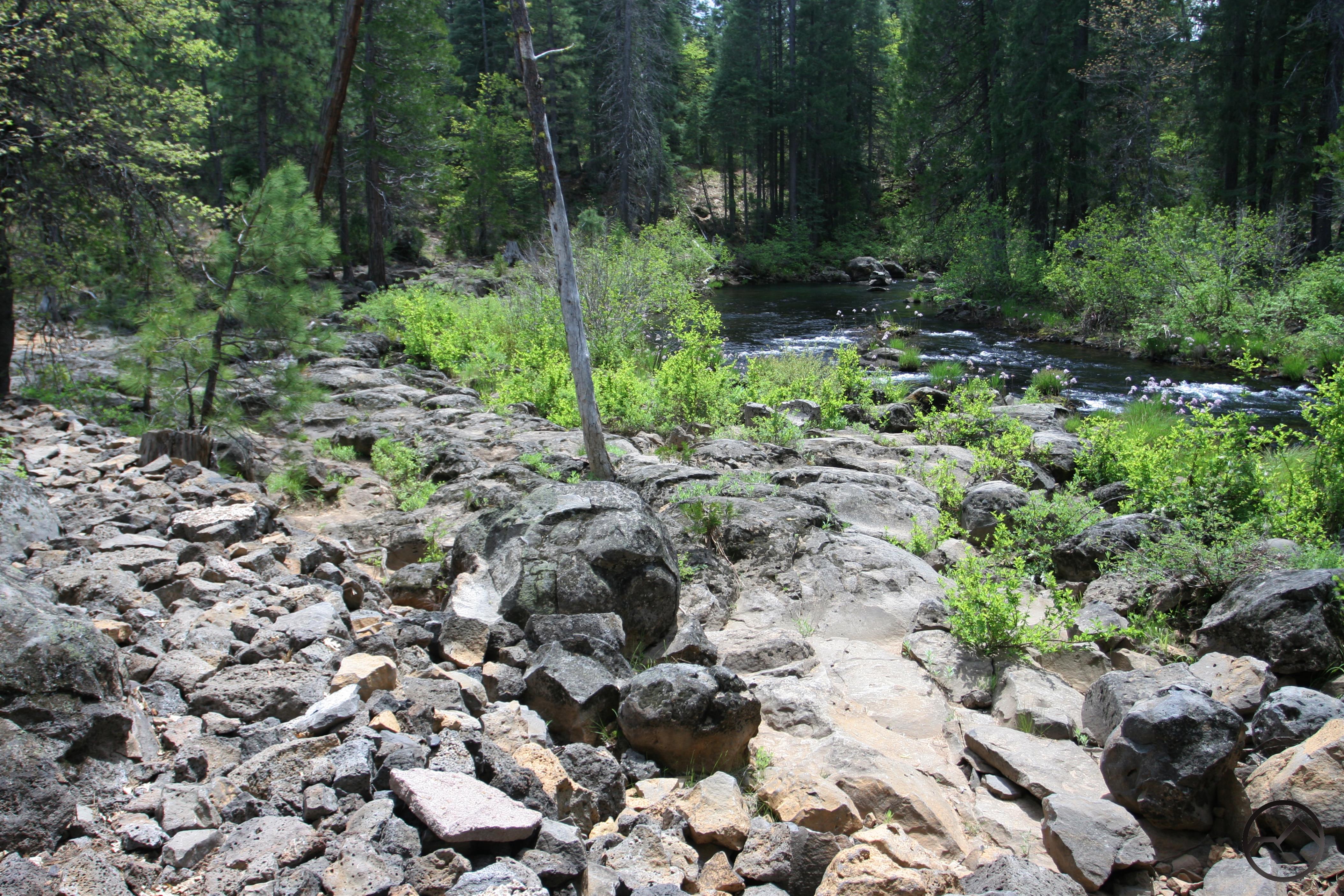 Beyond the Upper Falls overlook, the trail parallels the river through a picnic area. Most people end the hike here and turn around to head back to the trailhead at Lower Falls. While the spectacle of the three McCloud waterfalls is now left behind, for those who want to hike longer and enjoy the river more, the trail continues. Persevering is strongly recommended. Beyond the picnic area, the trail stays close to the river, now much more placid, as it winds through rocky outcroppings and dense forest. At times the trail is constructed out of piles of rugged lava rock. Since this section of trail does not see many hikers, mountain bikers have adopted it as their own. While they too are somewhat infrequent, use be aware of the possibility they may be around while hiking. There are a few more decaying picnic trails scattered randomly along the trail, but most are falling apart. Keen observers will also notice a few concrete pylons, remnants of a small aqueduct that once carried water from the river to the town of McCloud.