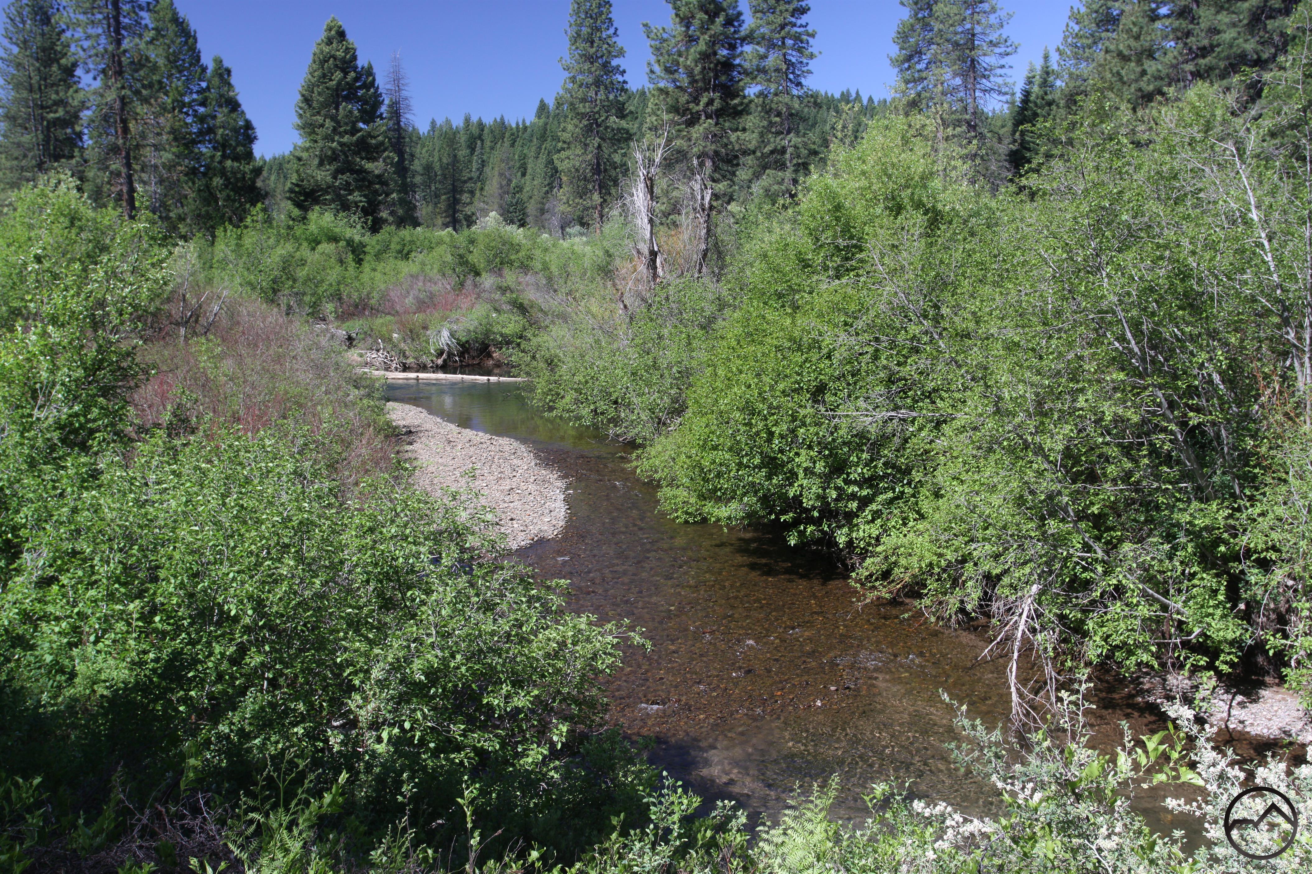 Past the spring the trail turns completely away from the river as it crosses an old dirt road. It continues west, well away from the river and passes through a pleasant forest consisting primarily of ponderosa pine and cedars, along with a few firs and some riparian denizens. After maintaining a westerly course through the increasingly monotonous woods for 0.65 miles the trail makes a turn to the south and emerges onto a dirt road. Although the trail continues on the far side of the road, it is worth making the short jaunt to the south on the road to the Bigelow Bridge, essentially a large steel plank that provides access to the far side of the McCloud. There is a fantastic swimming hole beneath the bridge and a large, albeit rocky, beach from which to enjoy the water. Beyond the bridge the rivers current quickens as it passes through a hedge of riverside brush. The entire area around the bridge makes a fantastic spot to stop, take a break, and enjoy a dip in the river.