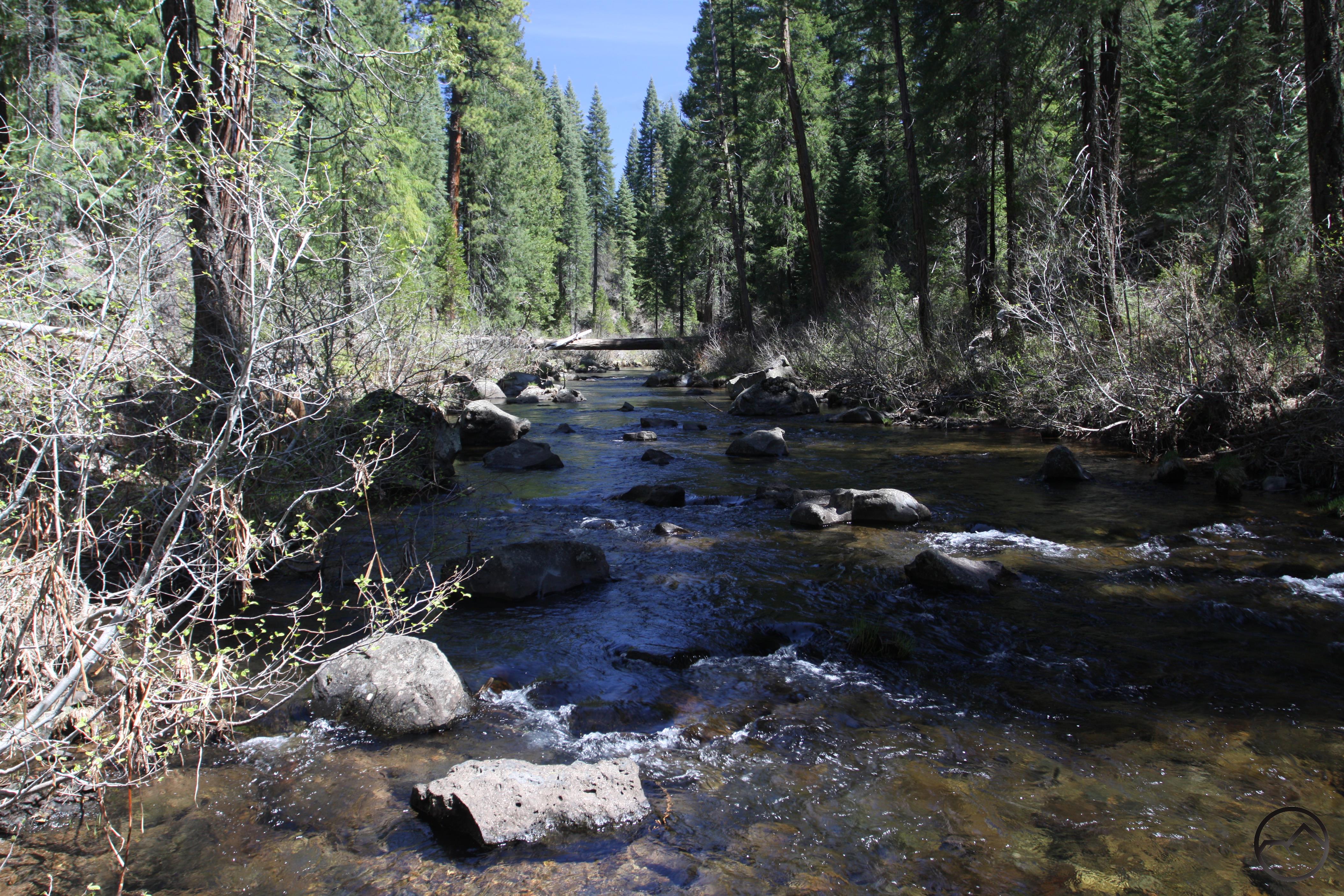 Soon this section also bids farewell to the shallow canyon as the area opens up a bit and the trail and river finally part ways as well. They meet up again at the end of the hike at Camp 4. Once an old logging camp, Camp 4 is now a Forest Service group camp. Not available for common use, large groups can reserve the campground. It is an extremely pleasant area. Large old growth trees abound and the river runs along the perimeter of the campground. On the north side of the area there is a sizable meadow. As the McCloud River skirts the meadow it passes through a bit of a boulder strewn gully. The lightly colored soil exposed by the river is partially composed of tufa, which is volcanic ash. This type of formation becomes much more common between Middle and Lower Falls, further downstream. This is another reminder of the regions volcanic past and certainly one of the more interesting. Unless utilizing a shuttle, hikers must eventually depart and make the long walk back to the Cattle Camp swimming hole.