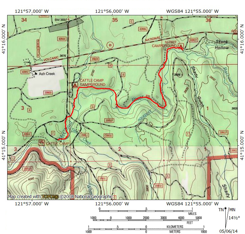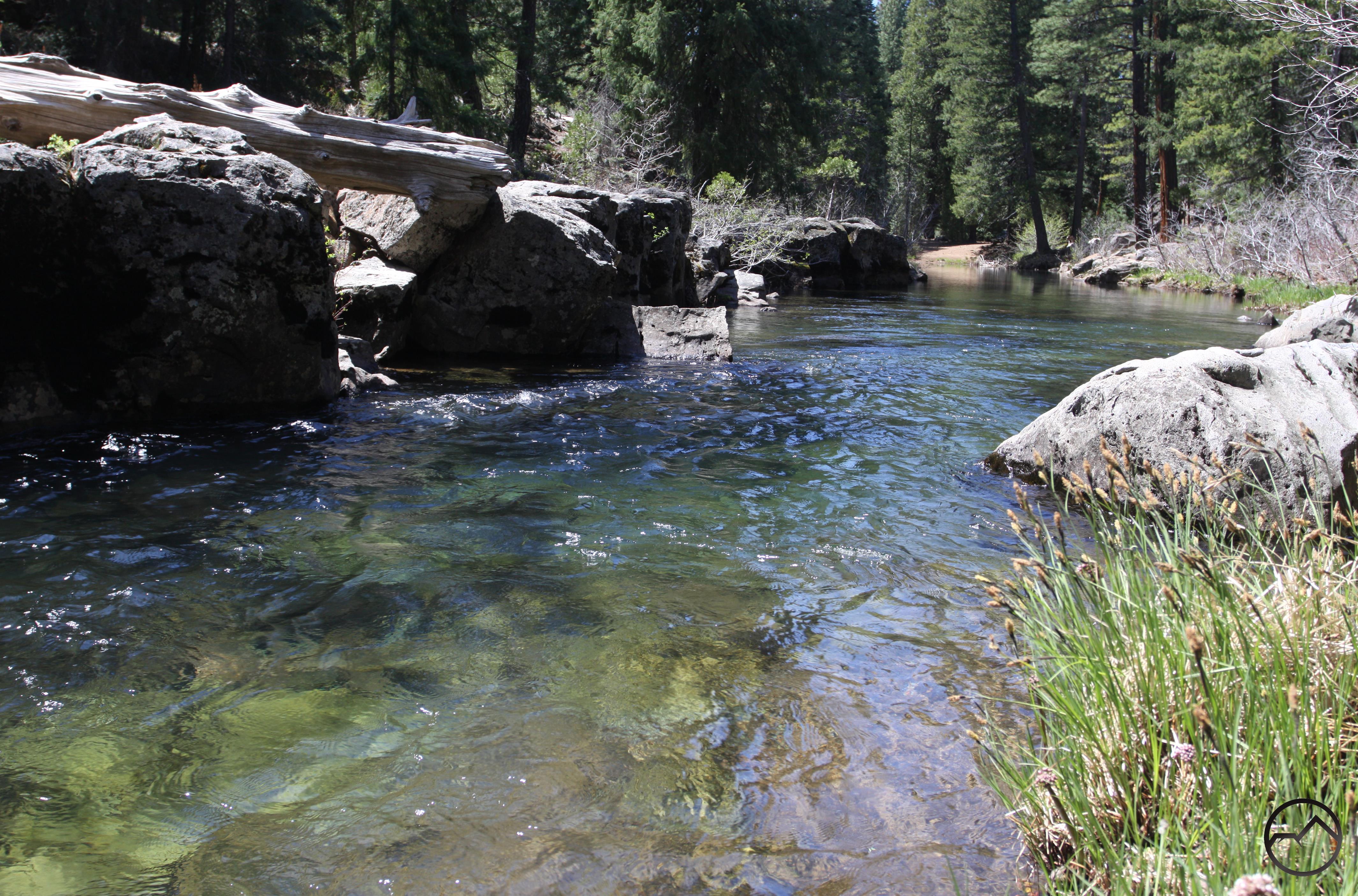 Nitwit Camp is an official primitive Forest Service campground. This means…very little. Dispersed camping is permitted throughout the National Forest so the distinction means nothing except that at Nitwit, like nearby Skunk Hollow, they have provided a picnic table. No other amenities are found here. In spite of this it is a great spot. The river runs alongside numerous great campsites while the forest is tall and the understory generally clear, allowing easy exploration. A small meadow area also adds to the setting. The McCloud River Trail is a bit indistinct here since it blends in with the dirt road that accesses the campsites. To find the path, head to the westernmost part of the clearing, near the meadow area. At that point the trail is easily discernable. Once on the trail it stays pleasantly close to the river. Unfortunately, this is not an enduring condition. After 0.35 the trail veers away from the water. Still, the path is pleasant, weaving through tall stands of trees and past boulders of dark basalt. Since the Algoma area, there has been little indication of this regions volcanic past and these boulders are reminders of the fiery events that took place here, though they only hint at the volcanic evidence further down the trail. Another 0.25 miles from where the path and the river parted company they meet again and maintain a parallel course for a while. Unfortunately the trail is well above the water and dense brush makes getting to the water’s edge difficult.