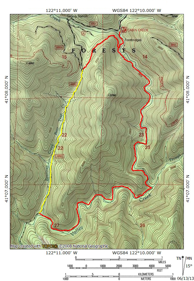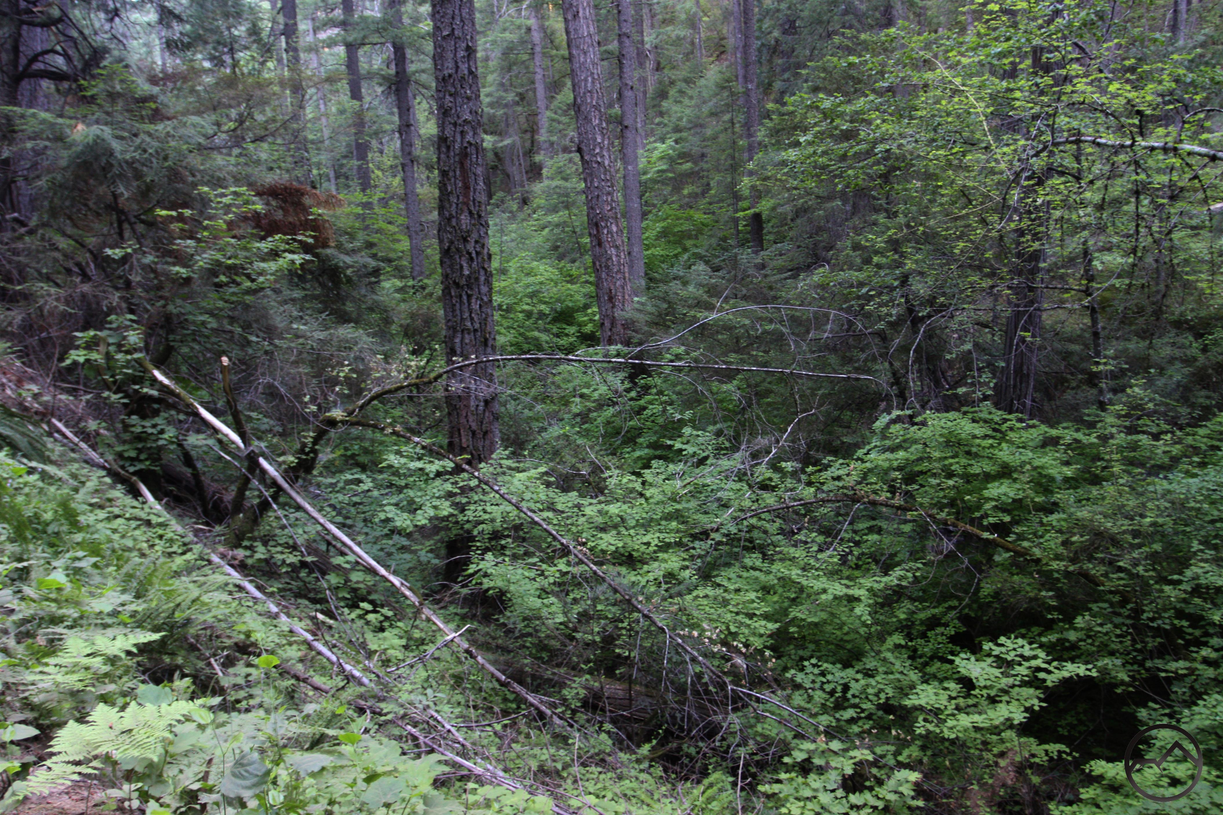 About 0.9 miles from the junction with the Squaw Valley Creek Trail a sign mounted on a tree indicates the PCT’s arrival at “the Octopus”, a nexus of trails and dirt roads. This is the highest point of the entire hike. Turn to the left and head down the main road. The PCT turns to the left and climbs up a different dirt road for a short distance before reverting back to single track. A short distance from the Octopus a gate blocks vehicles from descending down Bear Trap Creek’s canyon. Simply hike down the road as it stays alongside the creek. The first mile of the road maintains a fairly steep grade and will make hikers glad they tackled this part of the loop first. Notice how there is little to no water in the creek bed at the head of the canyon. As it drops deeper into its canyon seeps and springs feed an increasingly larger creek. About halfway down the road the canyon narrows and the creek is brought right up against the roadbed at a very tight choke point. Shortly after this a significantly tributary joins Bear Trap Creek and increases its size substantially. Throughout the first part of the trip down the road a dense canopy of small tree blocks views of the creek. After the choke point the creek is visible more often. Finally, after 2 miles from the Octopus, the road crosses over the creek. A couple hundred yards further up the road a sign indicating the Cabin Creek Trail is on the left, where the trail joins the road. It is possible to stay on the road a little further to where it crosses over Squaw Valley Creek to see the creek as it heads down toward the McCloud River.