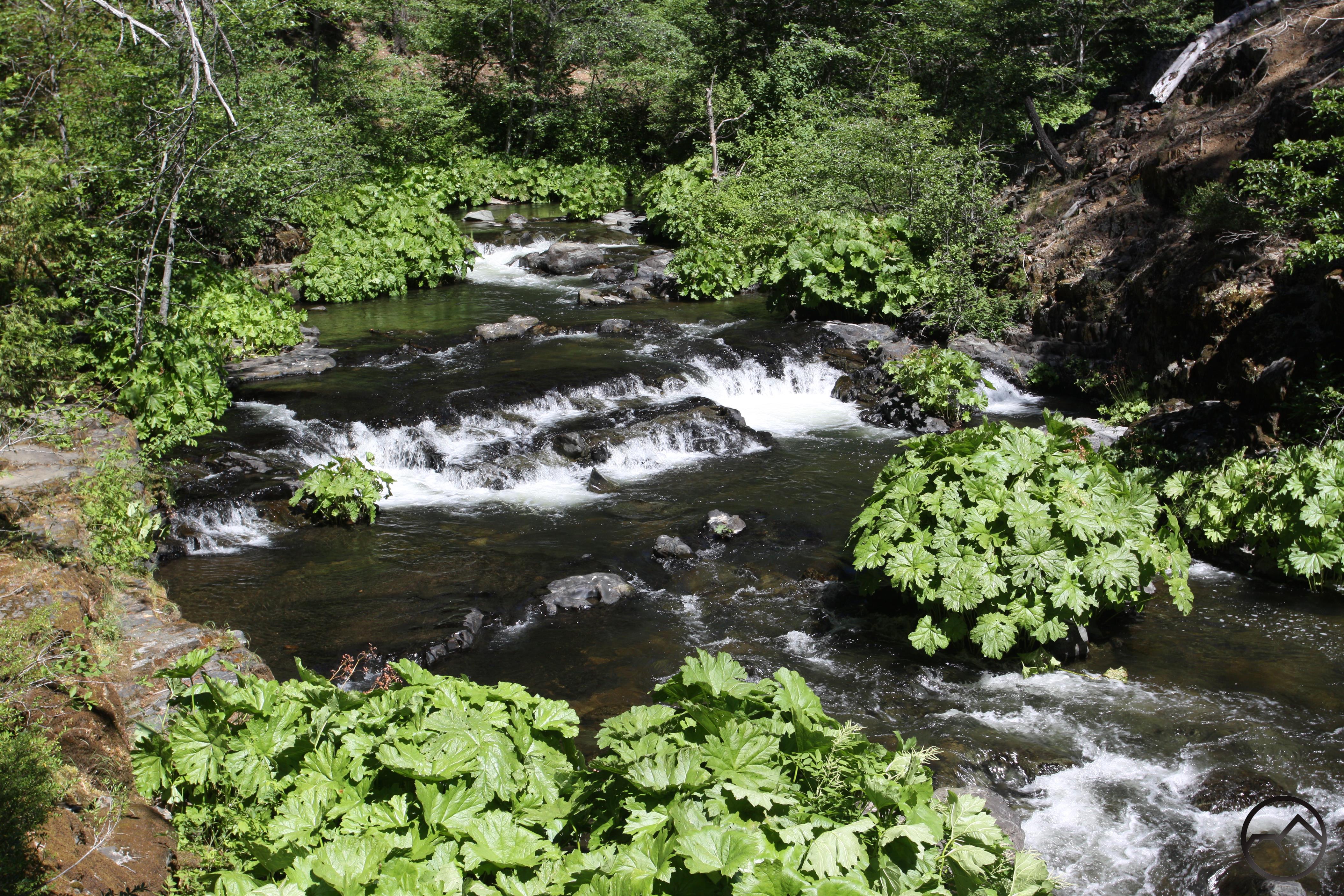 The Squaw Valley Creek Trail is the only maintained trail in the McCloud area (with the exception of the Pacific Crest Trail) that does not parallel the McCloud River. That does not mean that there are not similarities between the trails along the McCloud and the trail that follows Squaw Valley Creek. At first, hearing a trail is similar to other trails does not sound like a ringing endorsement. Why bother with the trail if you can find the same things elsewhere? This may be a natural reaction but in the case of the Squaw Valley Creek Trail, the similarities all match the positive attributes of the trails along the McCloud River and it is hard to argue against more of a good thing. In many ways, the Squaw Valley Creek Trail is a smaller version of the McCloud River Trails. The creek, though not as large as the McCloud, is a substantial waterway and has carved an impressive canyon of its own. It is a boisterous creek lined by Indian Rhubarb and boasting numerous small cataracts creating a significant amount of interest along its course. Though they are not nearly as large as the waterfalls on the McCloud River, Squaw Valley Creek does have a couple of pretty little waterfalls. Not all of its charms imitate the creek’s larger neighbor. Squaw Valley Creek crashes through a short but very scenic, rocky gorge. Moreover, unlike any of the other trails in the McCloud area, this trail has the option of being done as a loop.
