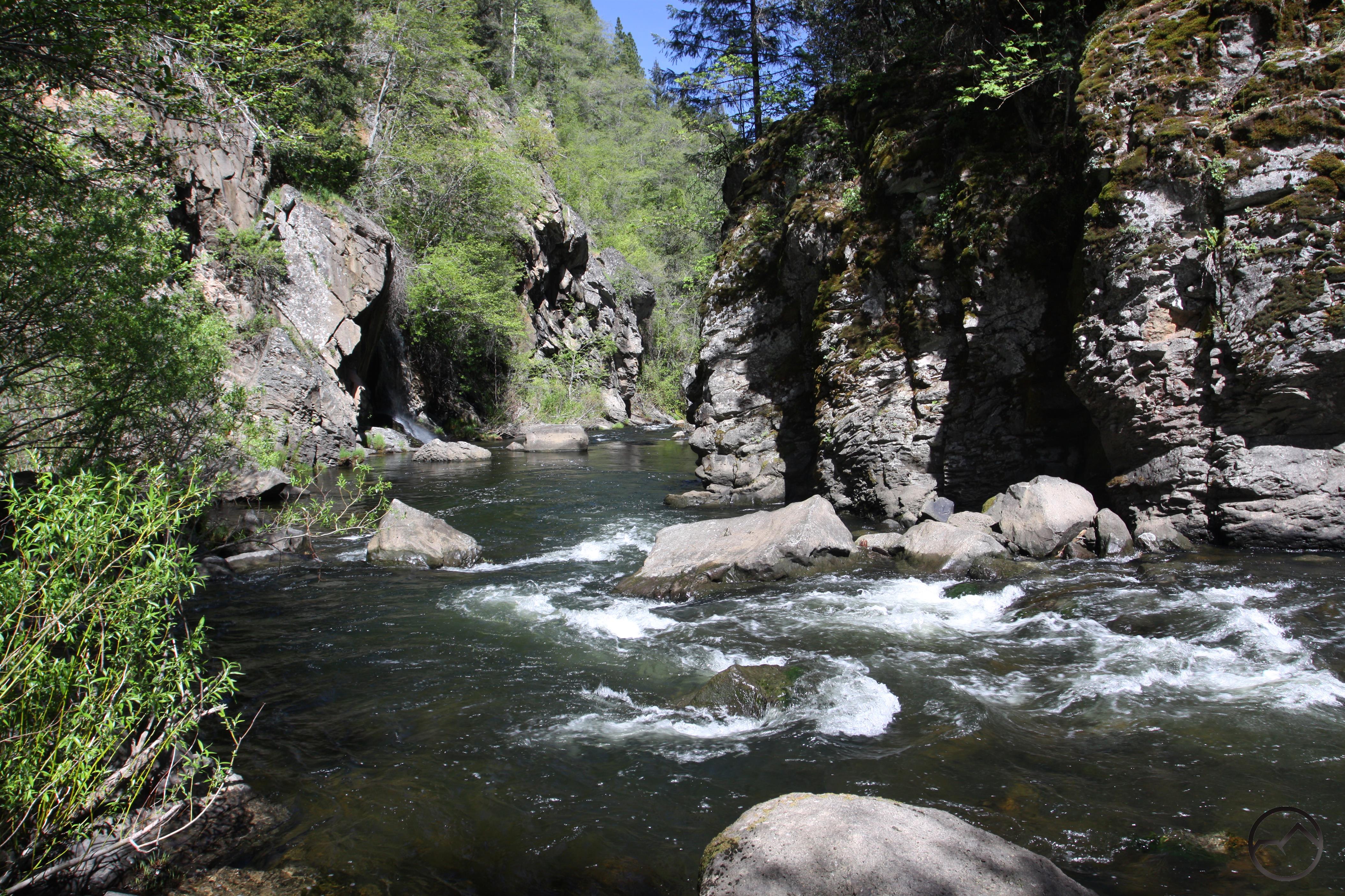 The Box Canyon Trail begins on the north side of the Box Canyon Dam. It begins with a very mild descent, passing through a mixed forest of ponderosa pine, cedar and oak, as well as brush, much of which is composed of manzanita. After only 0.1 miles, an obvious, wide trail splits off to the south. This is the trail that descends into the bottom of the Box Canyon. A description of that route will follow the description of the main trail. Beyond the junction with the route into the canyon, the trail proceeds to the west and instantly comes upon a broad, arcing slope of the canyon wall, covered with what must be several thousand river rocks. It seems to be in place to prevent erosion. It must have taken a staggering amount of work to gather and place all of those stones. At the very bottom of the stone embankment is a small spring and its subsidiary stream that passes through a very narrow ribbon of meadow. This can be accessed by the descent route. Above the stone embankment one can see the edge of the Mount Shasta Resort Golf Course, including greens, pathways and a small bridge that carts can drive on. As one hike above the stones, look down into the canyon to observe a pretty waterfall falling down the cliffs into the Sacramento River.